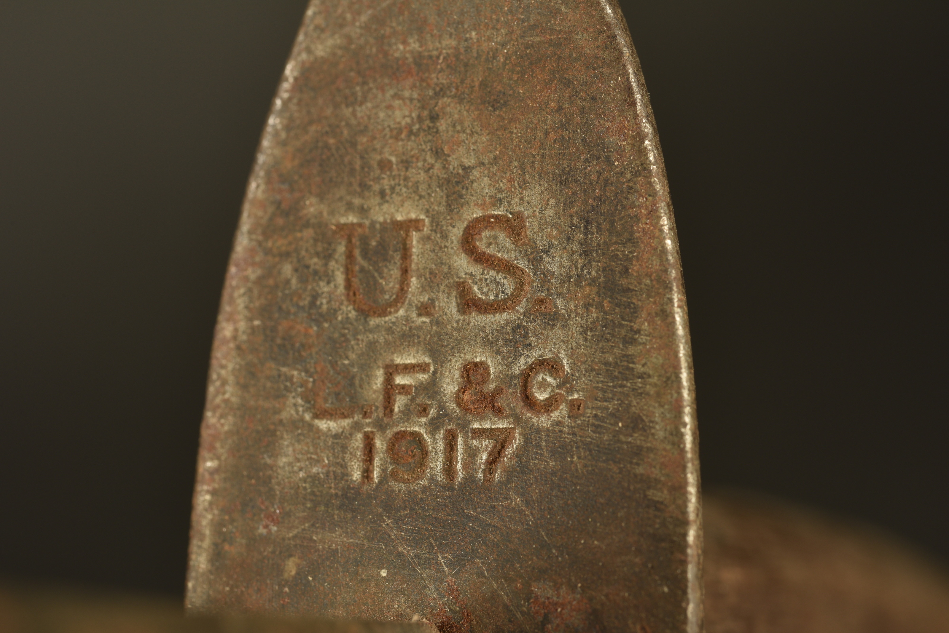 Lame en triangle, Manche en bois. Garde pourvu de protubérances en forme de pyramide. Marquages US LF&C 1917. Fourreau manquant. A noter une certaine usure et oxydation de la pièce. Cette... en savoir plus