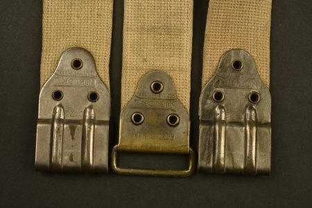 En toile kaki, complète, les parties métalliques sont légèrement usées, couleur passée, les pièces métalliques sont marquées Nobuckl Pat D 72114. A noter une légère usure et patine de... en savoir plus