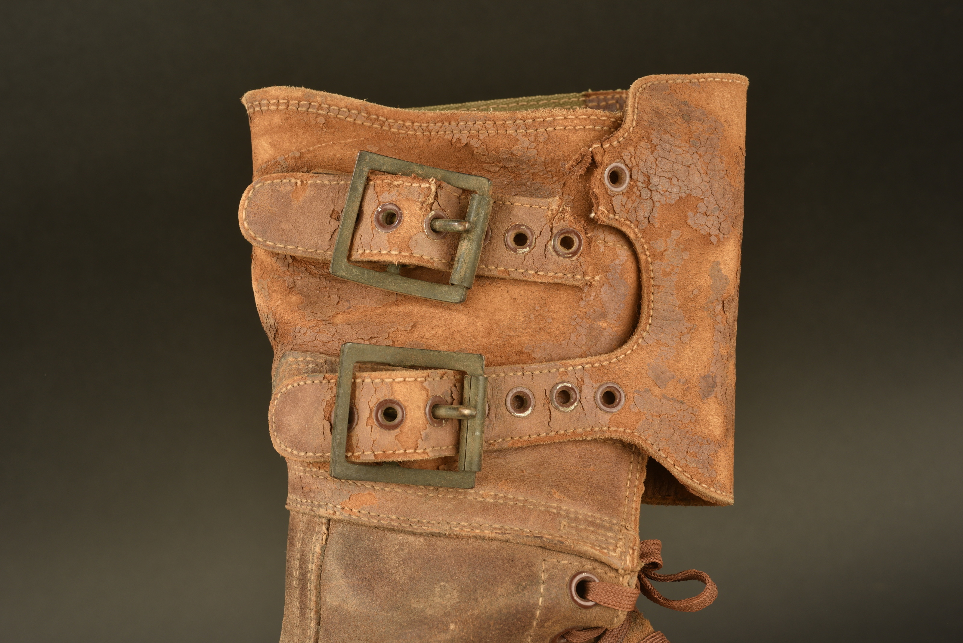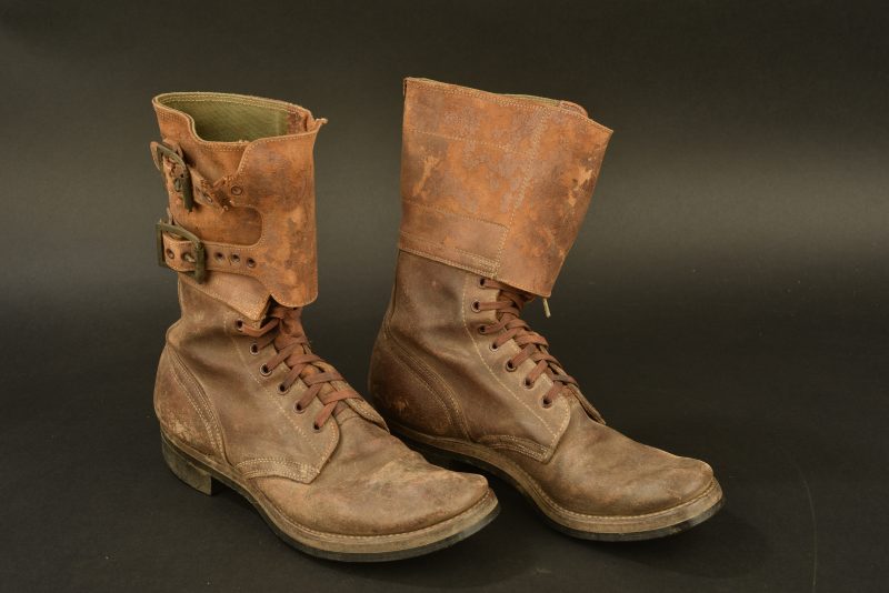 En cuir fauve, sept œillets de laçage, les lacet sont présents et du modèle réglementaire. Jambière attenante présente. Reste de marquages visibles. Semelles usées, marquées New Jersey... en savoir plus