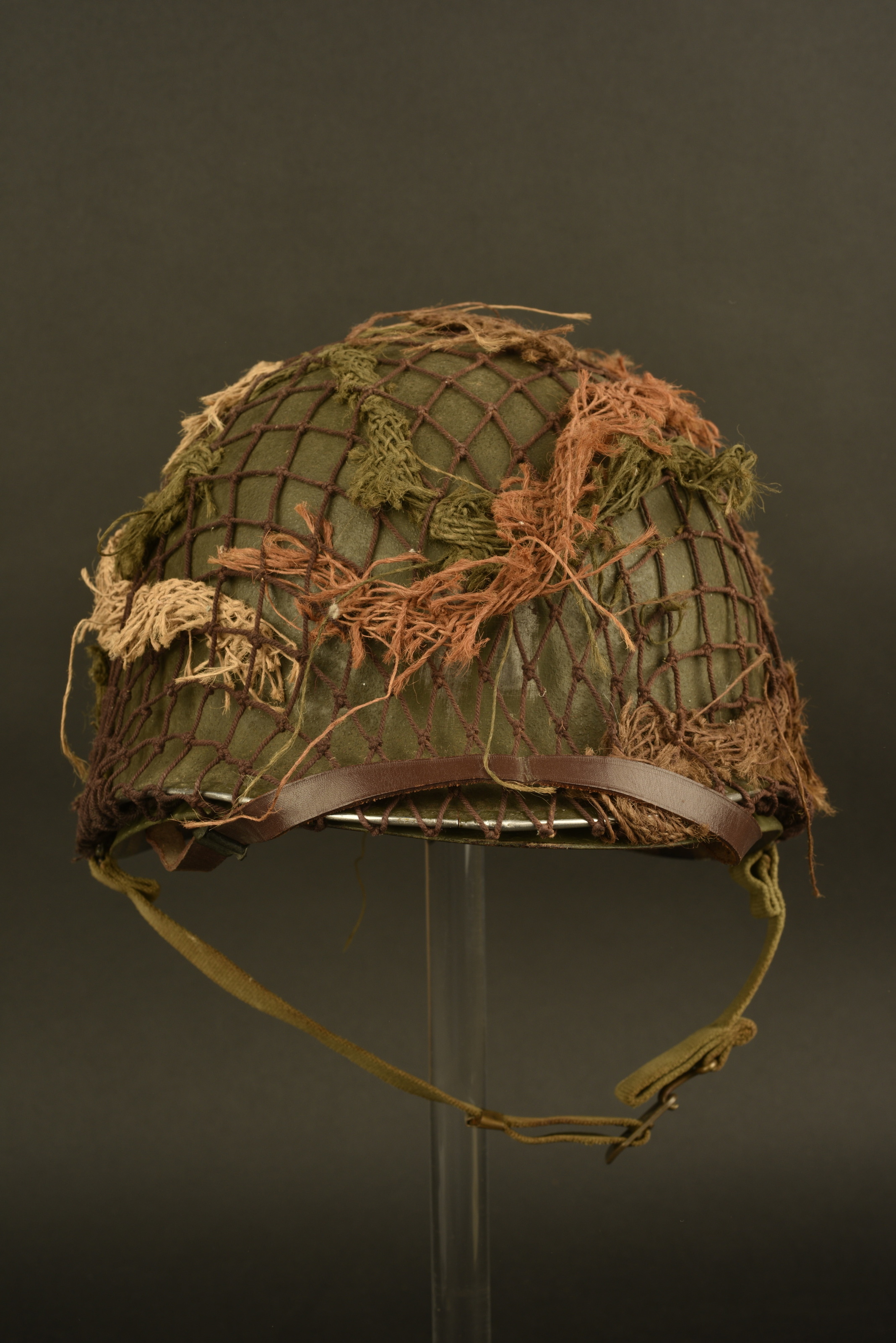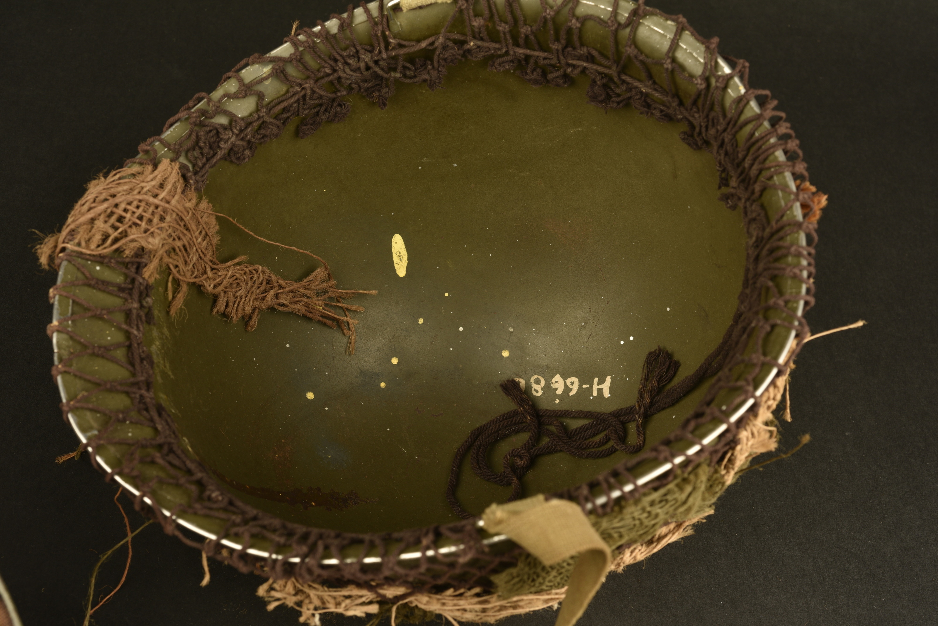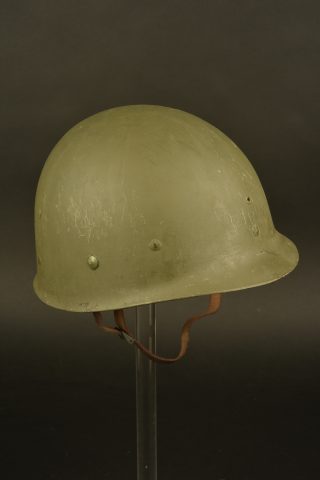 Coque de casque USM1, pontets fixes, jugulaires présentes et visiblement montées d’origine. Fermeture du jonc à l’avant. Numéro de lot 454L correspondant à une fabrication de février 1943. Peinture postérieure. Filet de camouflage fantaisiste, rajout d’un laundry number au fond de la coque H-6680. Liner en matériaux composite haute pression de fabrication Westinghouse. Intérieur complet, mais fatigué. Reproduction d’une jugulaire en cuir. Peinture extérieure à 80%, reconditionnée. A noter une légère usure et patine de la pièce. Photos supplémentaires sur www.aiolfi.com. Additional photos on www.aiolfi.com.