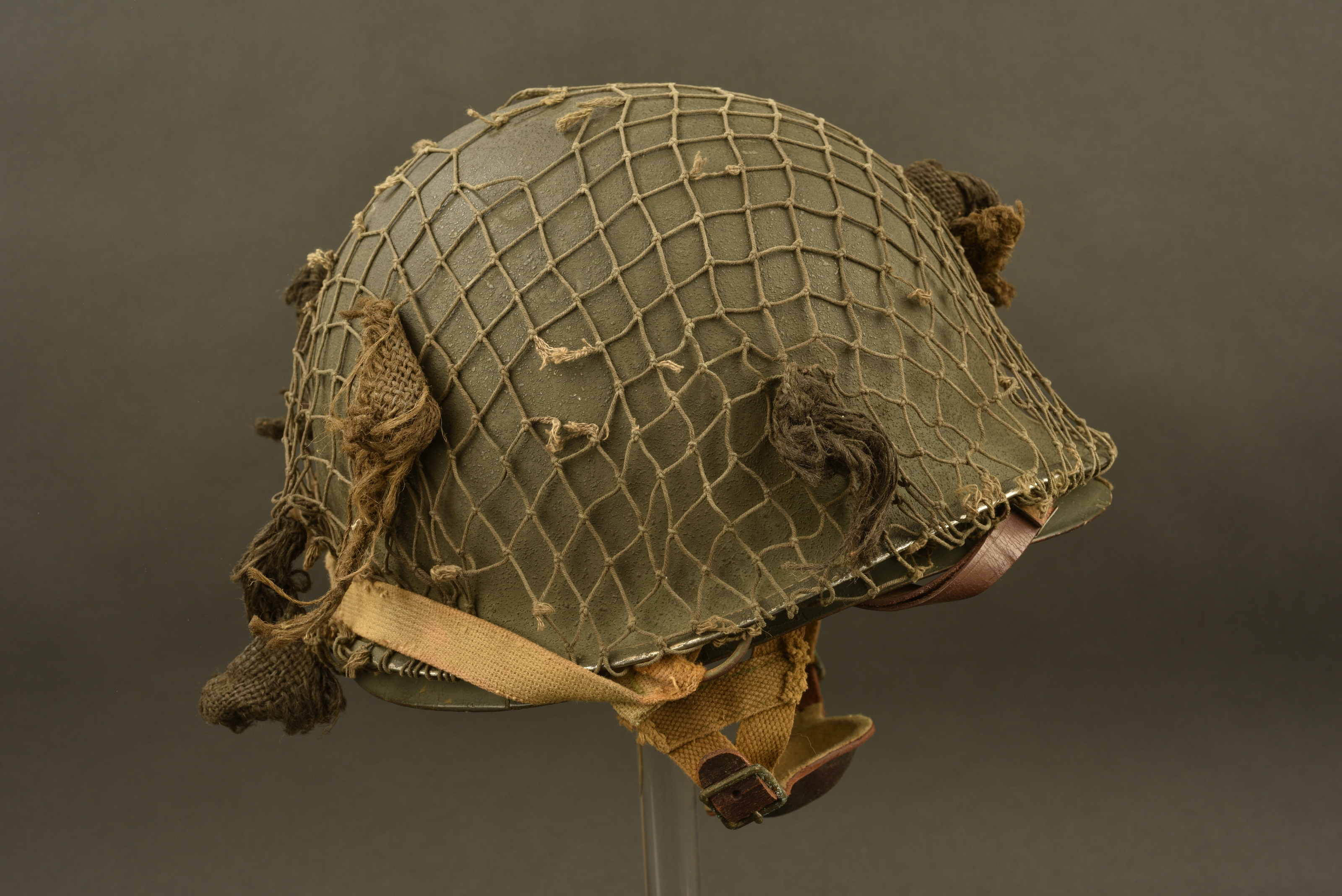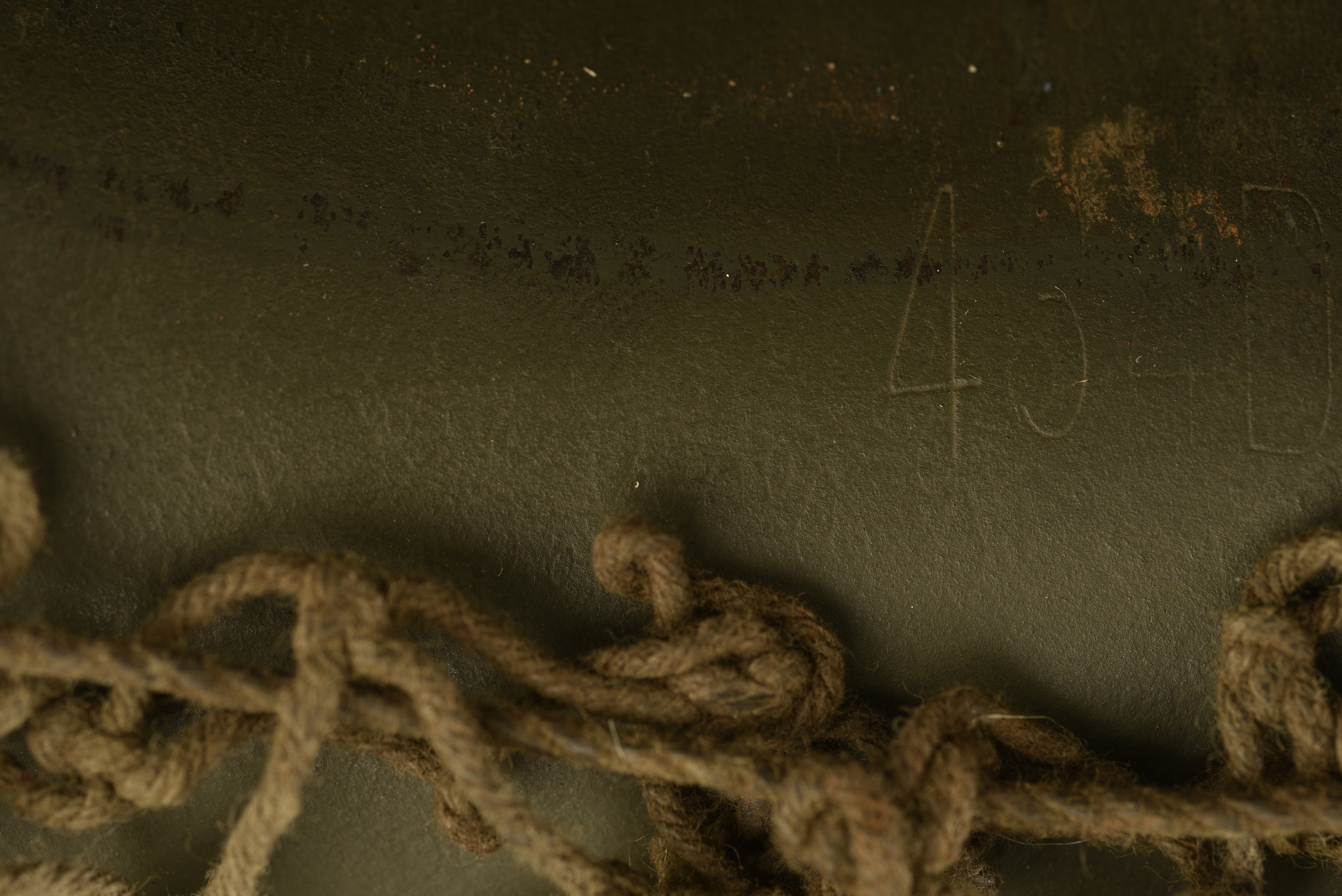 Coque de casque USM2, fermeture du jonc à l’avant, pontets demi-lune, jugulaires présentes. Numéro de lot 434 correspondant à une fabrication de février 1943. Peinture refaite, filet de... en savoir plus