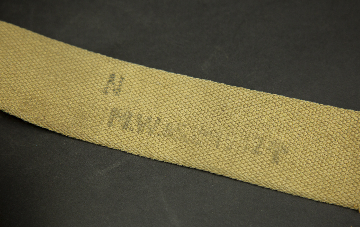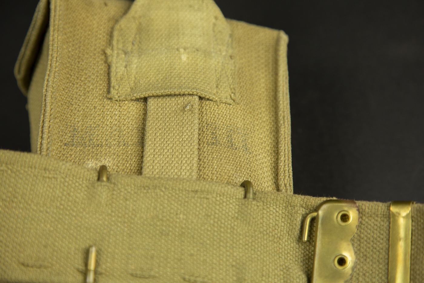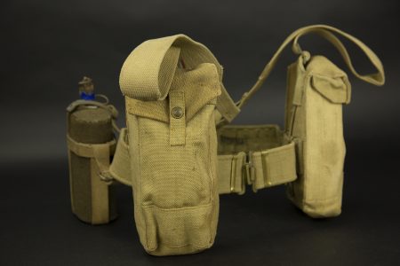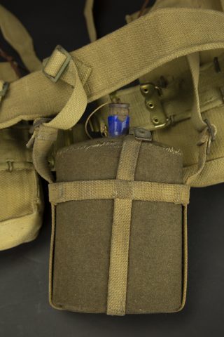 Comprenant deux bretelles en web, les marquages sont illisibles. Un ceinturon en web, marquages Normal, bouclerie en laiton. Deux pouch non homogène, datés 1942. Une gourde en métal émaillé... en savoir plus