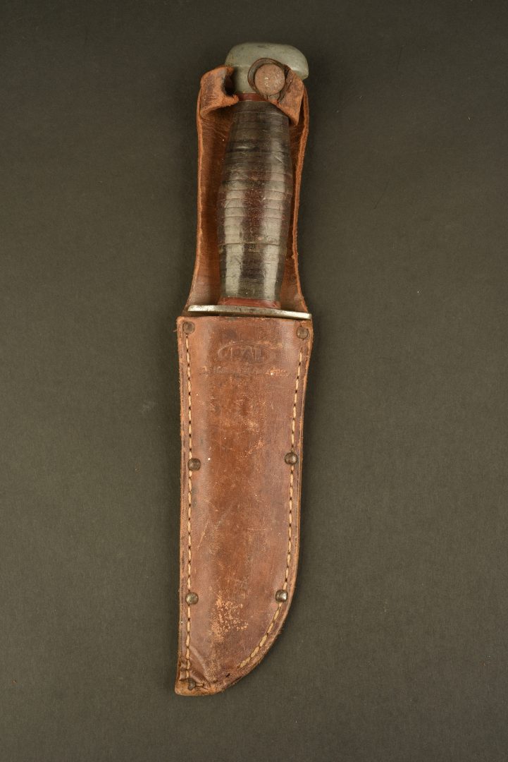 Manche composé d’anneaux en cuir. Pommeau métallique. Lame oxydée, marquée RH 36 Pal. Fourreau en cuir, bien marqué Pal, un bouton pression est manquant. A noter une certaine usure et... en savoir plus