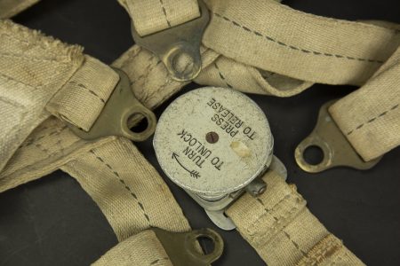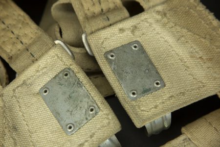En forte toile blanche surpiquée de fils noirs. Tous les crochets sont présents, ainsi que la boucle de fermeture. Marquages sur une lanière Server 15A:144 73560. A noter une certaine usure et... en savoir plus