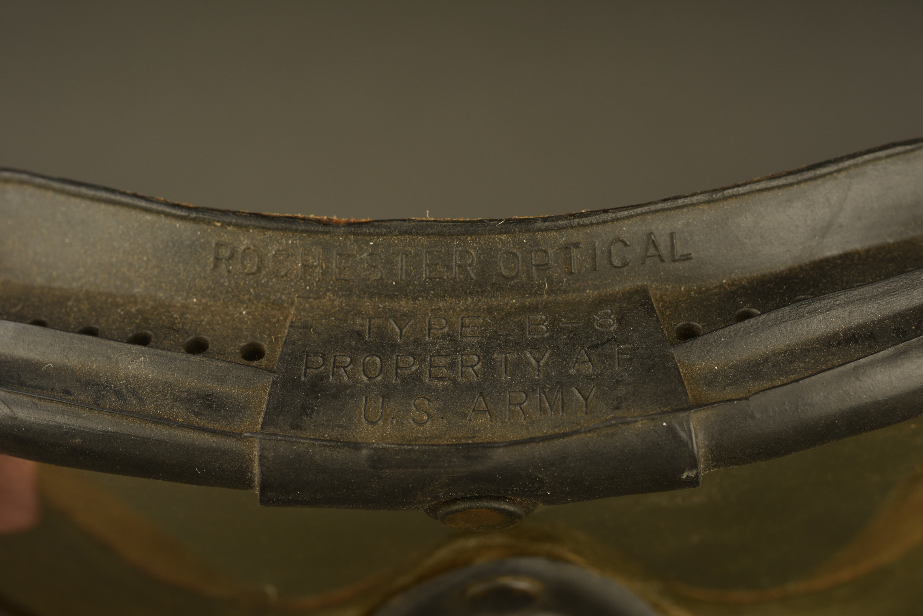 En caoutchouc, doublé de peau de chamois. Elastique en très bon état et souple. Verre blanc. Bien marquée Type B-8 Property AF US Army. A noter une certaine usure et patine de la pièce.... en savoir plus
