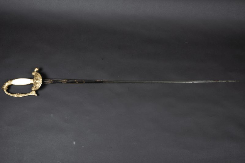 Monture en laiton dorée, branche moulurée avec tête de lion au centre et quillon terminé par tête de lion, fusée avec plaquettes de nacre, clavier en forme de bouclier contenant les armes... en savoir plus