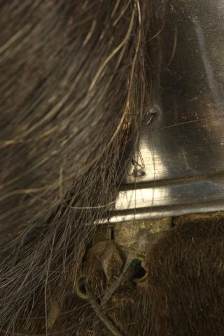 Bombe, visière et couvre-nuque en tôle d’acier; houpette écarlate, crinière en crins noirs. Jugulaires non réglementaires à anneaux entrelacés en forme de 8, d’usage fréquent.... en savoir plus