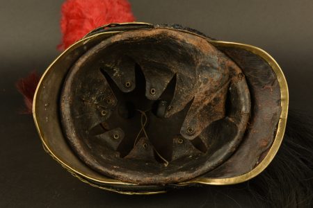Bombe, visière et couvre-nuque en tôle d’acier; houpette écarlate, crinière en crins noirs. Jugulaires à anneaux plats en cuivre assemblés en gourmette. Plumet écarlate (manque l’olive... en savoir plus