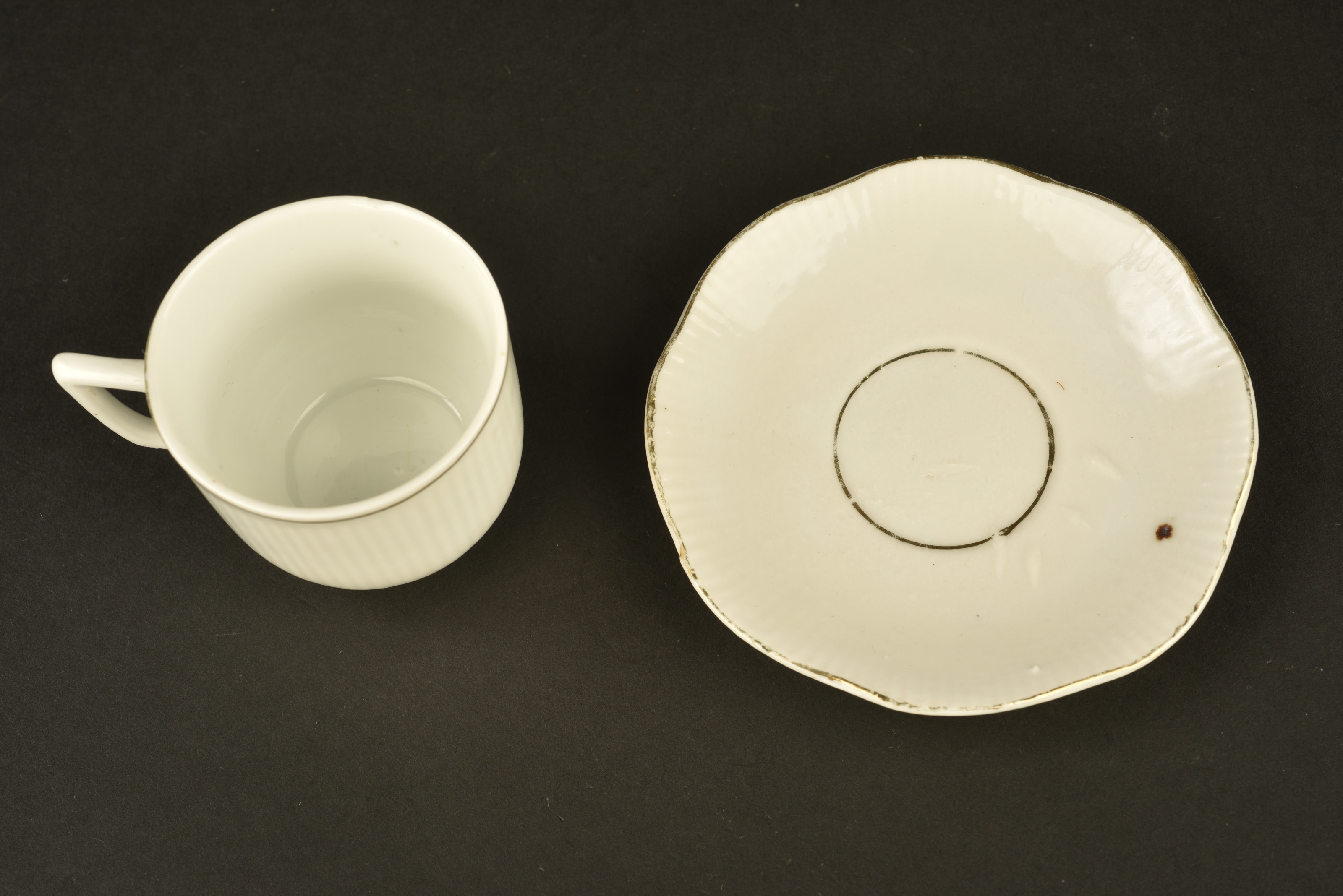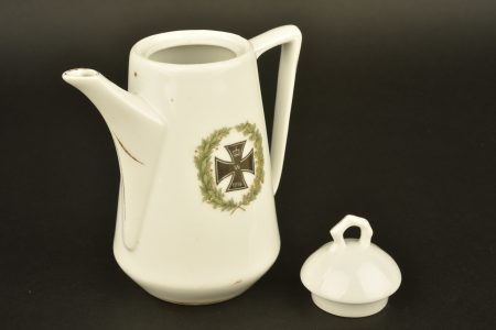 Comprenant une petite assiette patriotique, en porcelaine blanche décorée sur la partie haute d’une Croix de Fer et marquée 1914/15. Fabrication Bavaria J&C 4592. Diamètre 17 cm. Une assiette décorative Hindenburg, en porcelaine blanche, bordure ajourée. Portrait central d’Hindenburg. Attache postérieure. Les dorures sont en parfait état. Diamètre 24,5 cm. Une tasse et soucoupe patriotique, tasse à café en porcelaine blanche, décorée d’une croix de fer, liseré doré, sans marquages visibles. Soucoupe en porcelaine blanche, liseré doré partiellement effacé. Sans marquages visibles. Un pot à lait patriotique, en porcelaine blanche, décorée d’une croix de fer et de feuilles de chêne. Couvercle présent et complet. Sans marquages fabricant. Hauteur environ 15 cm. A noter une certaine usure des pièces. Photos supplémentaires sur www.aiolfi.com. Additional photos on www.aiolfi.com.