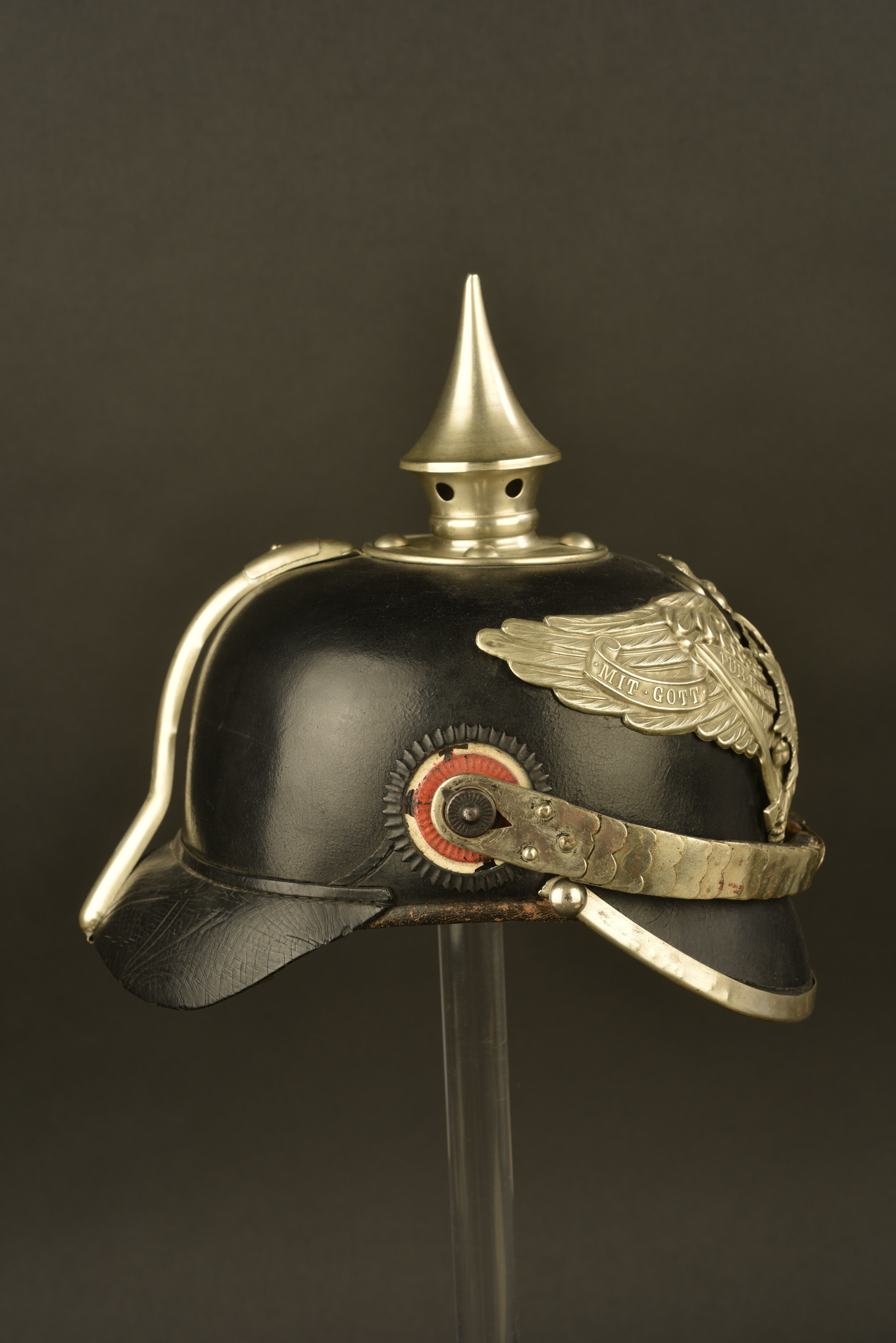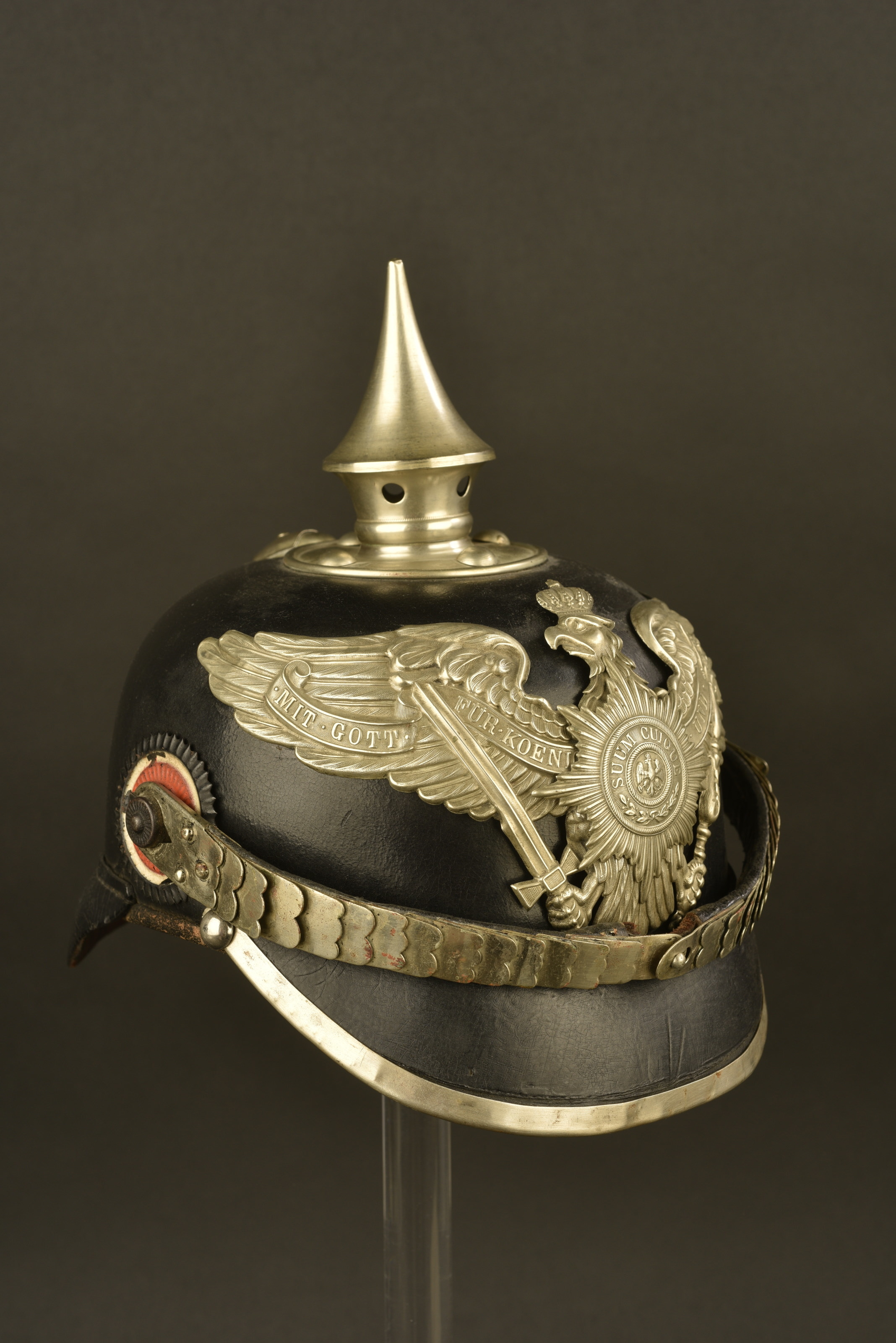 Modèle monté avec des garnitures 1895 sur une bombe modèle 1915 (tourillons et œillets fer). Ce type de coiffures se rencontre parfois. Jugulaire maillechort, (sans boucheton ni sangle).... en savoir plus