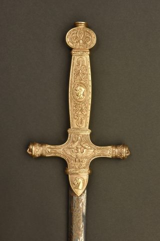 Poignée en bronze doré à l’or fin, représentant une tête de Minerve sur la fusée et une aigle impériale couronnée sur la garde. Lame bronzée et dorée au tiers, décorée de... en savoir plus