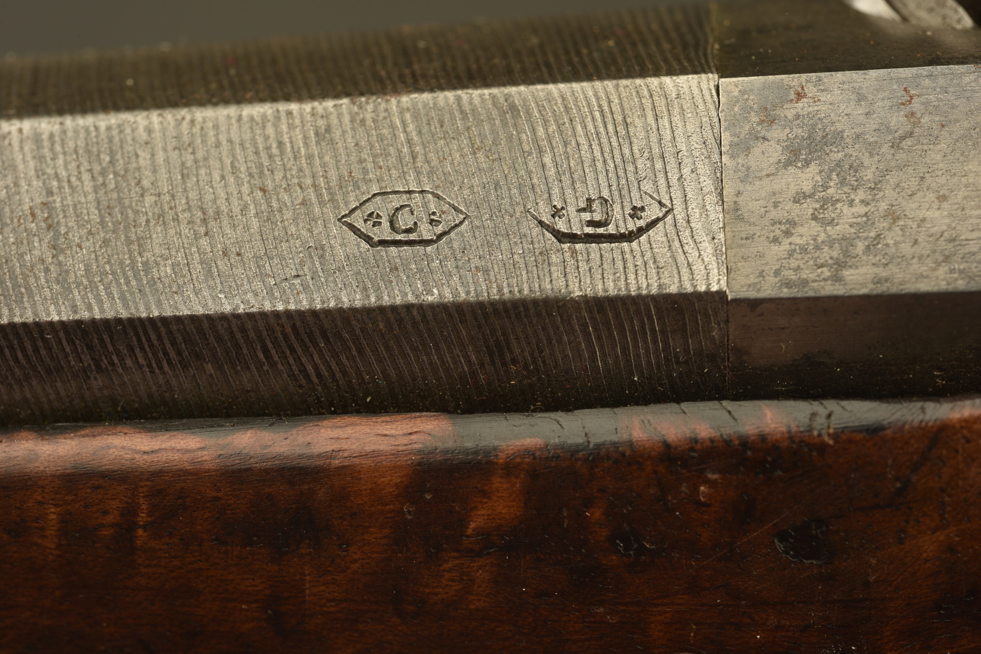 2ème type, Manufacture Nationale de Châtellerault 1849, une dosette d’origine dans la crosse, canon damas, rayures cheveu très bon état. Photos supplémentaires sur www.aiolfi.com. Additional photos on www.aiolfi.com.