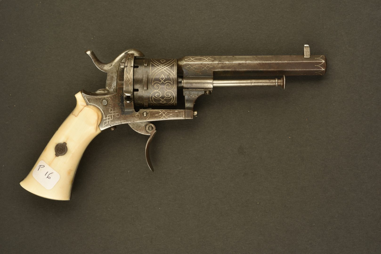 Calibre 7mm à broche fabrication Française. Double action. Canon octogonal de 9 cm avec initiales sur le dessus de canon ACC. Bronzé avec incrustation de filets d’argent. Plaquette de... en savoir plus