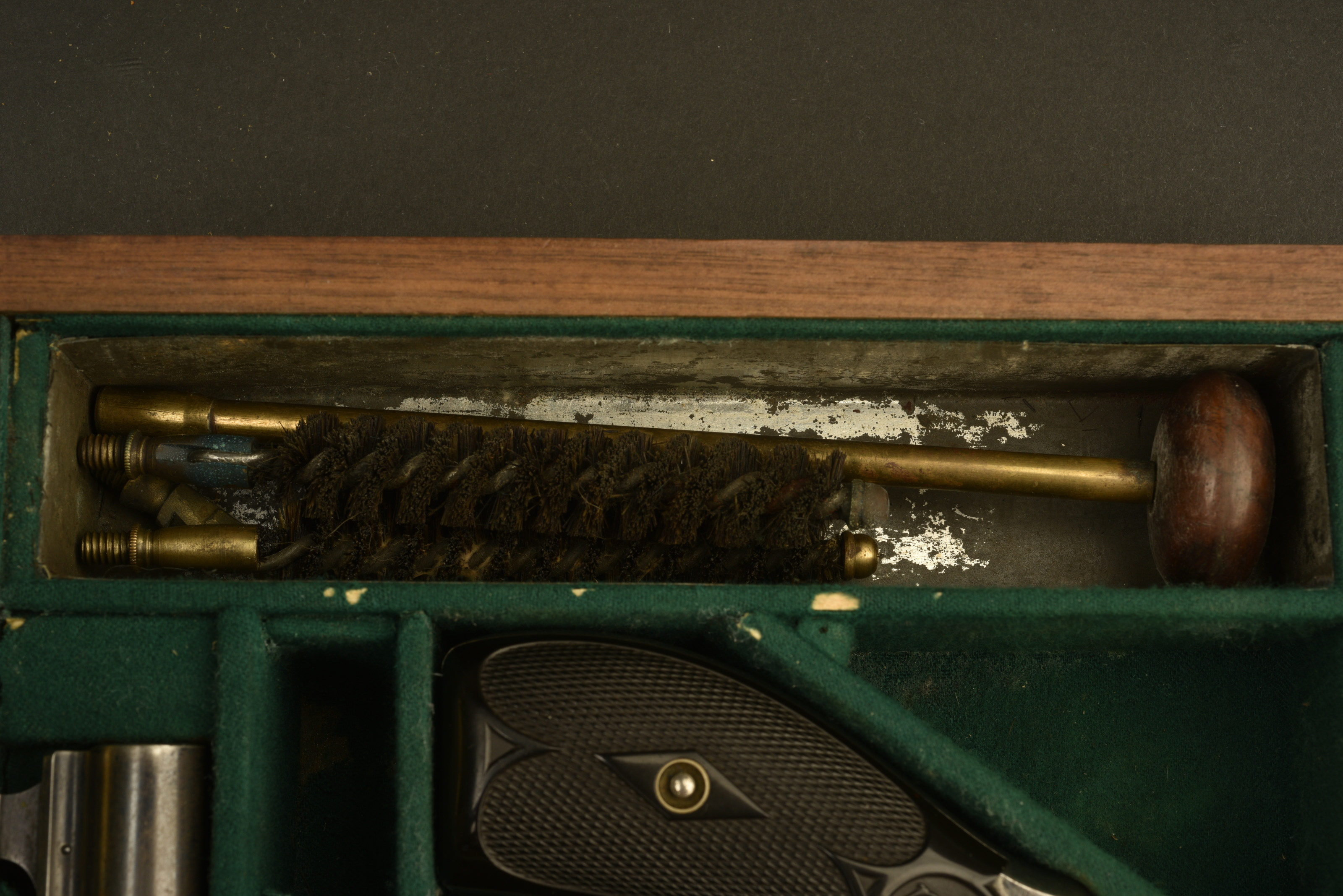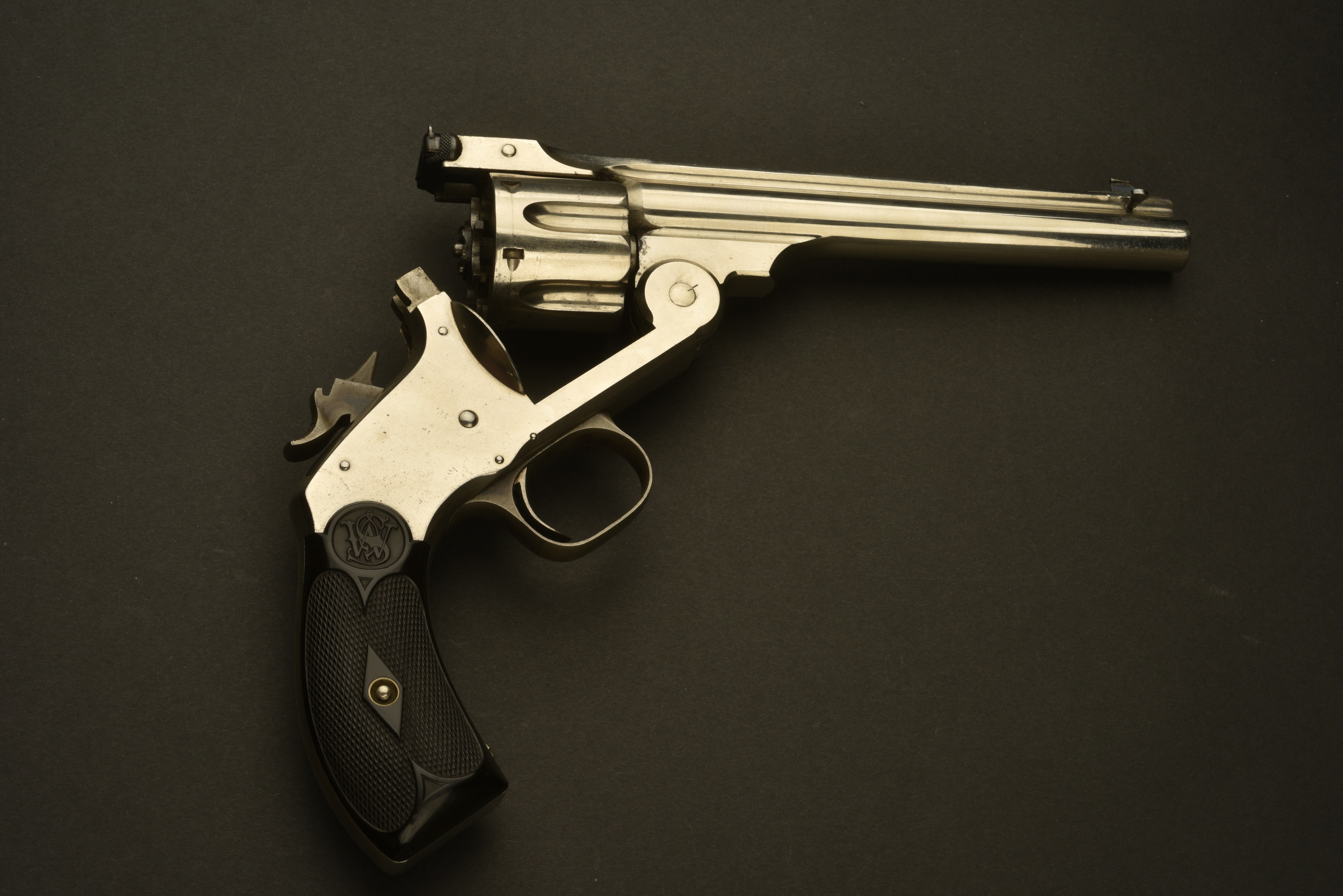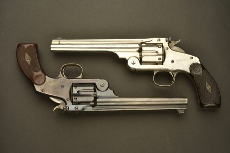 En calibre 44 S&W Russian, 1 bronzé, et 1 nickelé, deux boîtes métalliques contenant chacune 30 cartouches de 44 Russian d’époque, 1 tube de graisse Winchester d’époque avec une brosse, 1 écouvillon en laiton avec ses brosses, 1 embout en noyer pour basculer les canons sans se blesser, les revolvers sont en parfait état, le bleu à 99 % et le nickel à 99 %. Photos supplémentaires sur www.aiolfi.com. Additional photos on www.aiolfi.com.