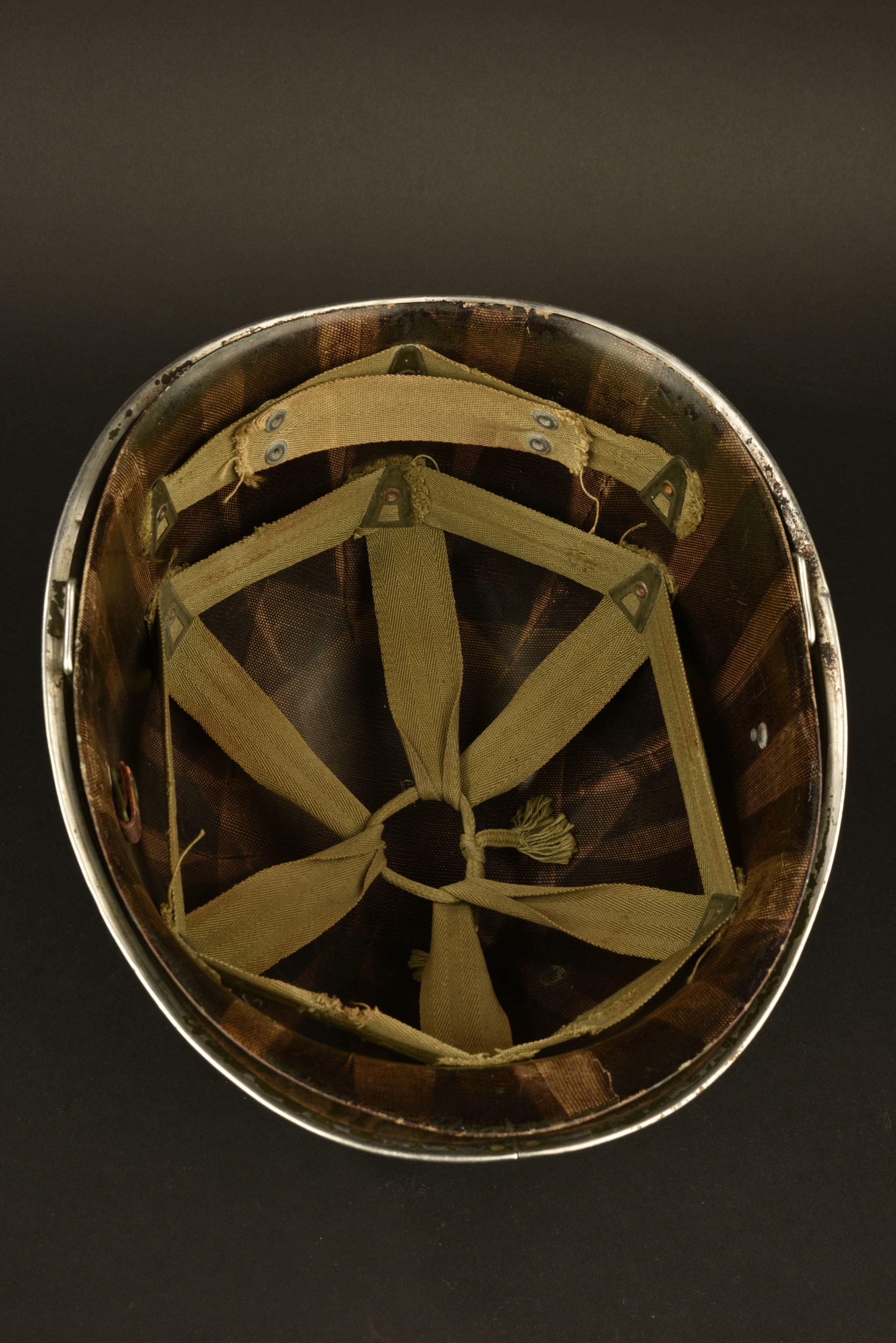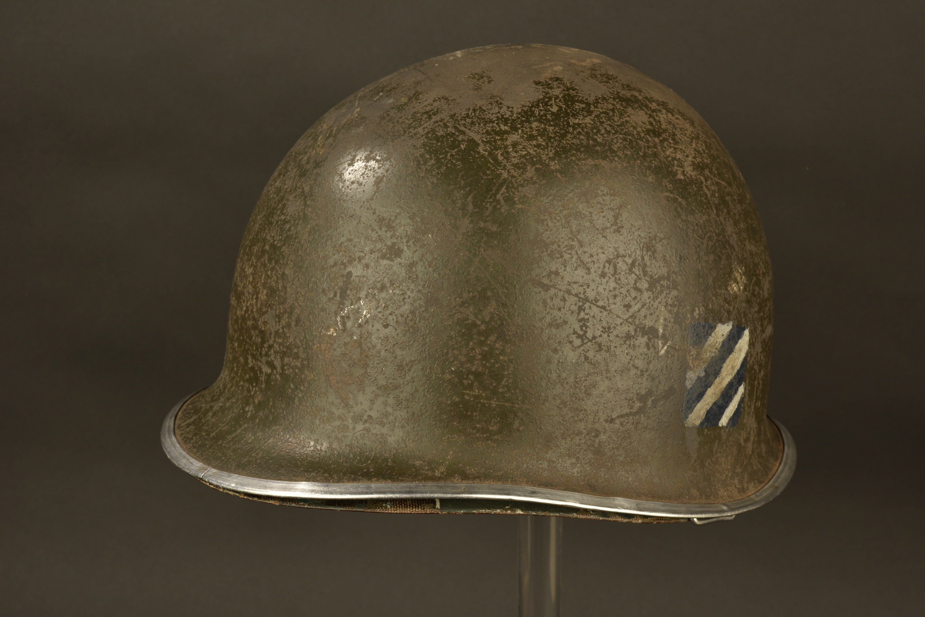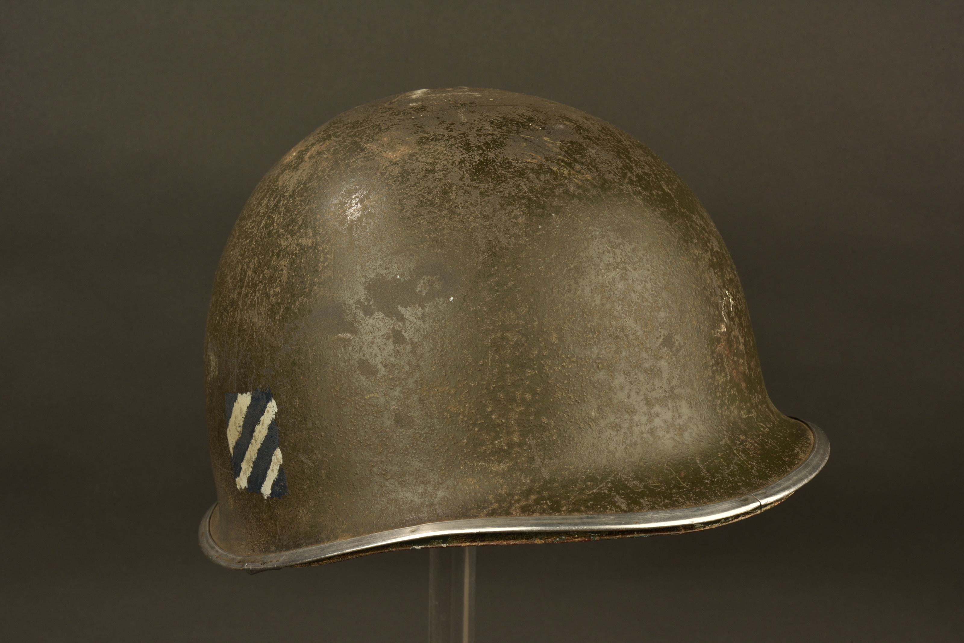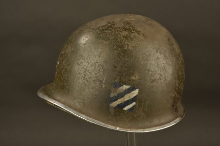 Coque de casque USM1, fermeture du jonc à l’avant, forte oxydation sous le jonc. Numéro de lot illisible. Pontets fixes. Jugulaires manquantes. Insignes de la 3ème DI US réalisés à la... en savoir plus
