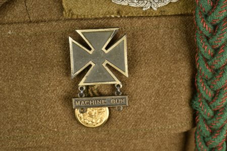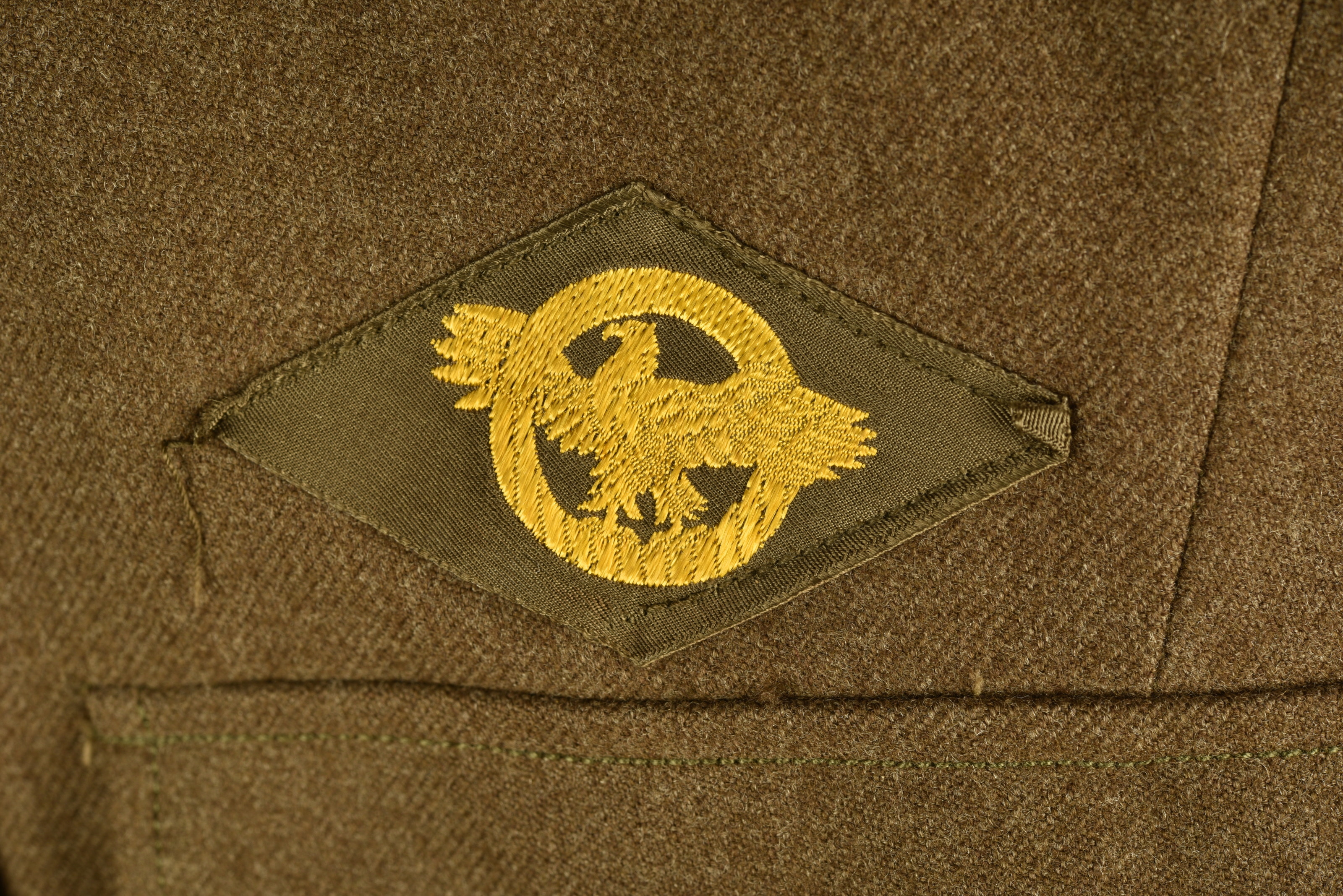 En drap kaki, tous les boutons sont présents. Disque de col représentant l’insigne de l’infanterie surmontant la lettre D. Disque de col troupe marqué US 18. Paire de crest du 18... en savoir plus