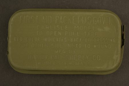 Boite en carton, complète, certains rabats sont déchirés, contenant dix boites en métal pour pansements individuels, complets, jamais ouvert. Boite marquée 10 Packet First Aid, Carlisle Model... en savoir plus