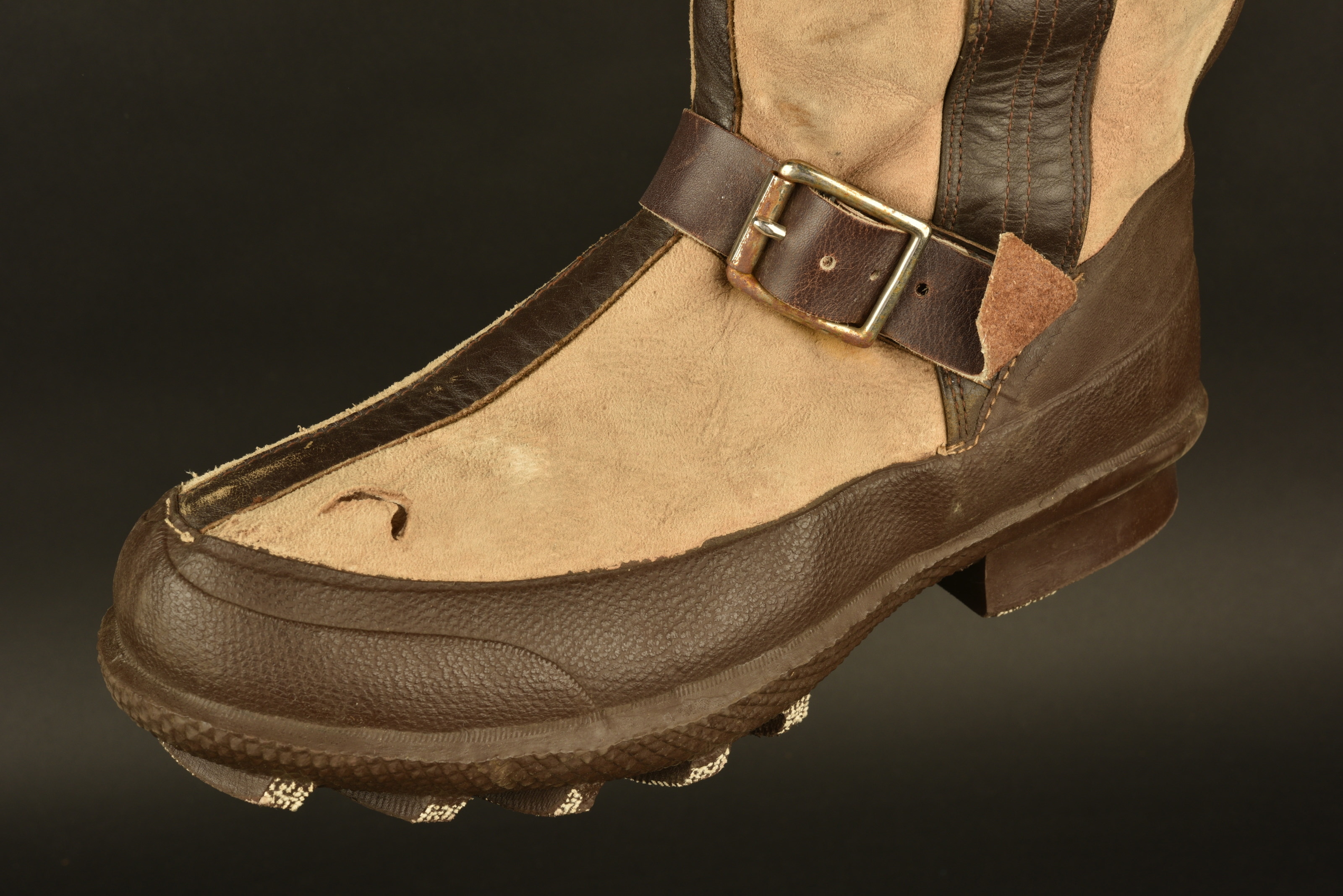 En daim beige, cuir marron et caoutchouc marron. Les lacets de serrage des bottes sont manquants. Marquages Army Air Forces présents. Semelles en caoutchouc neuves jamais portées. Paire... en savoir plus