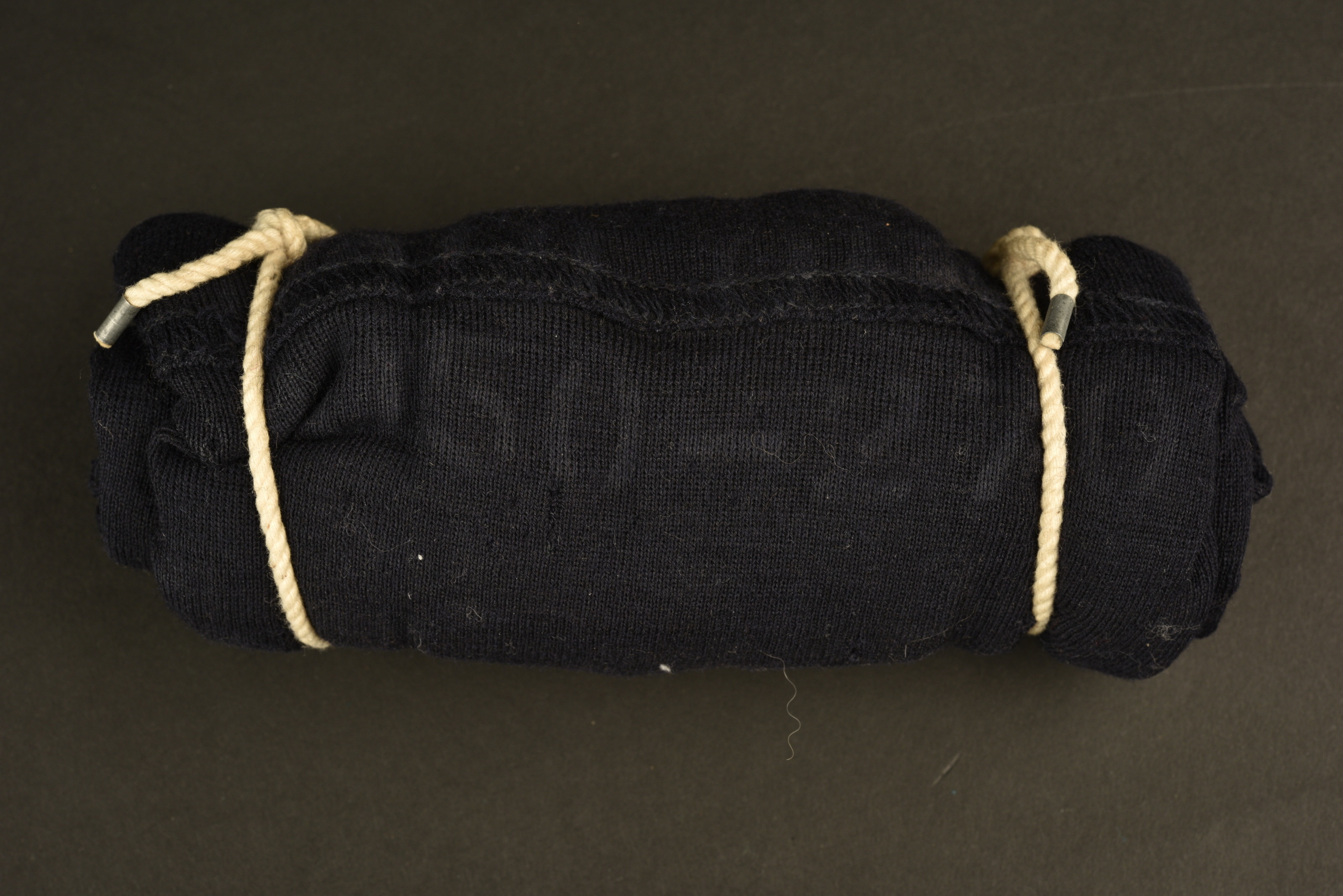 En tissu bleu marine, doublé de tissu blanc. Etiquette du Clothing Supply Office. Les cordons de serrage sont présents. Reste d’indication nominative illisible. Pièce roulée... en savoir plus