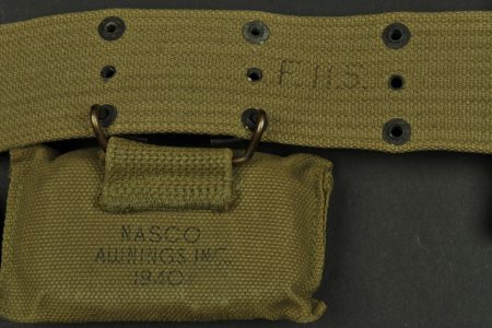 Comprenant un ceinturon US M-36, beau marquage US, bouclerie en métal peint, date illisible, indication nominative réalisée au pochoir FH Sanders. Une pochette de pansement individuelle,... en savoir plus