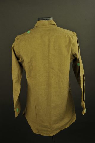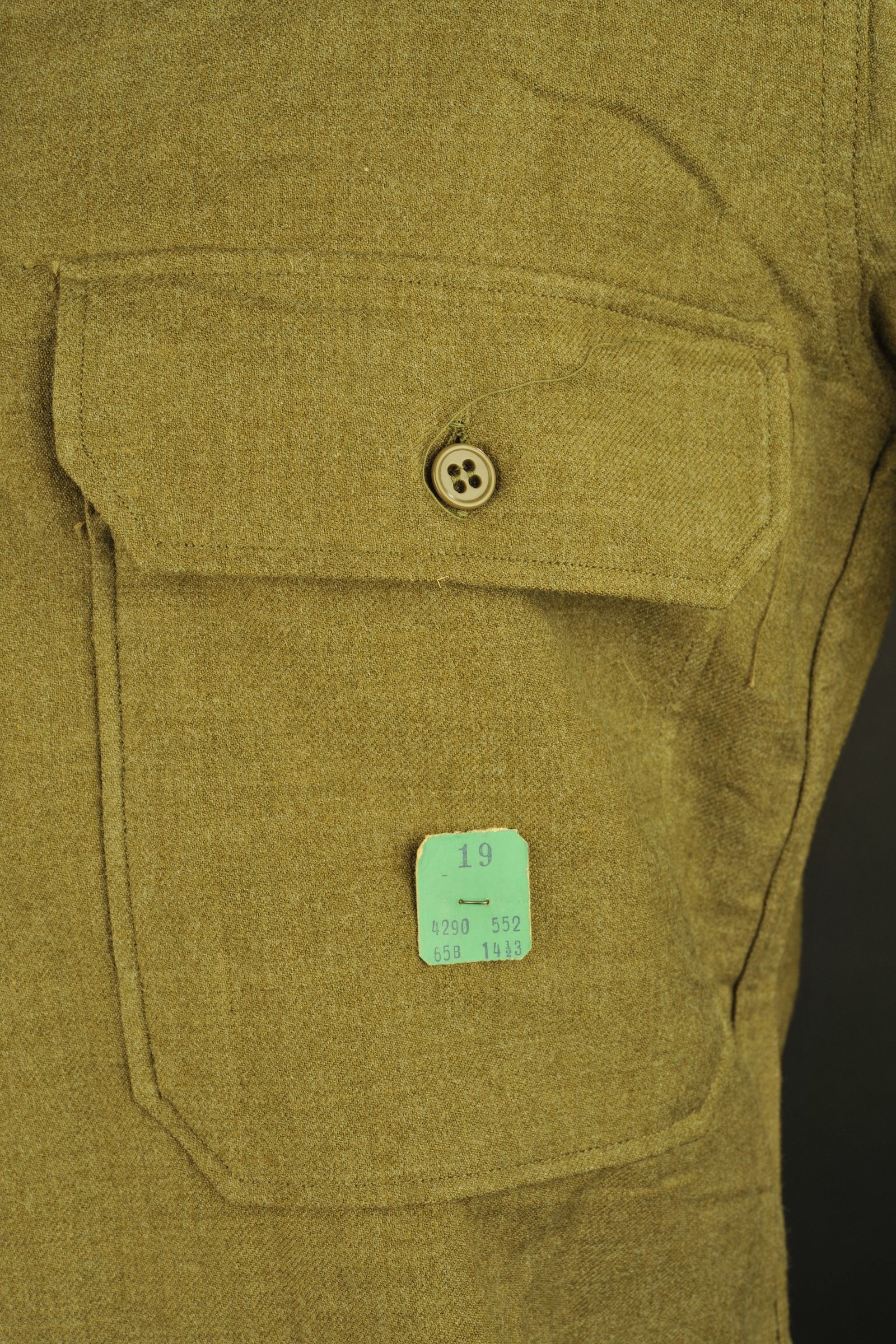 En tissu dit moutarde, tous les boutons sont présents. Bavette anti-gaz complète. Nombreuses étiquettes de stock de couleur verte. Etiquette dans le col indiquant une taille 14 1/2 33.... en savoir plus