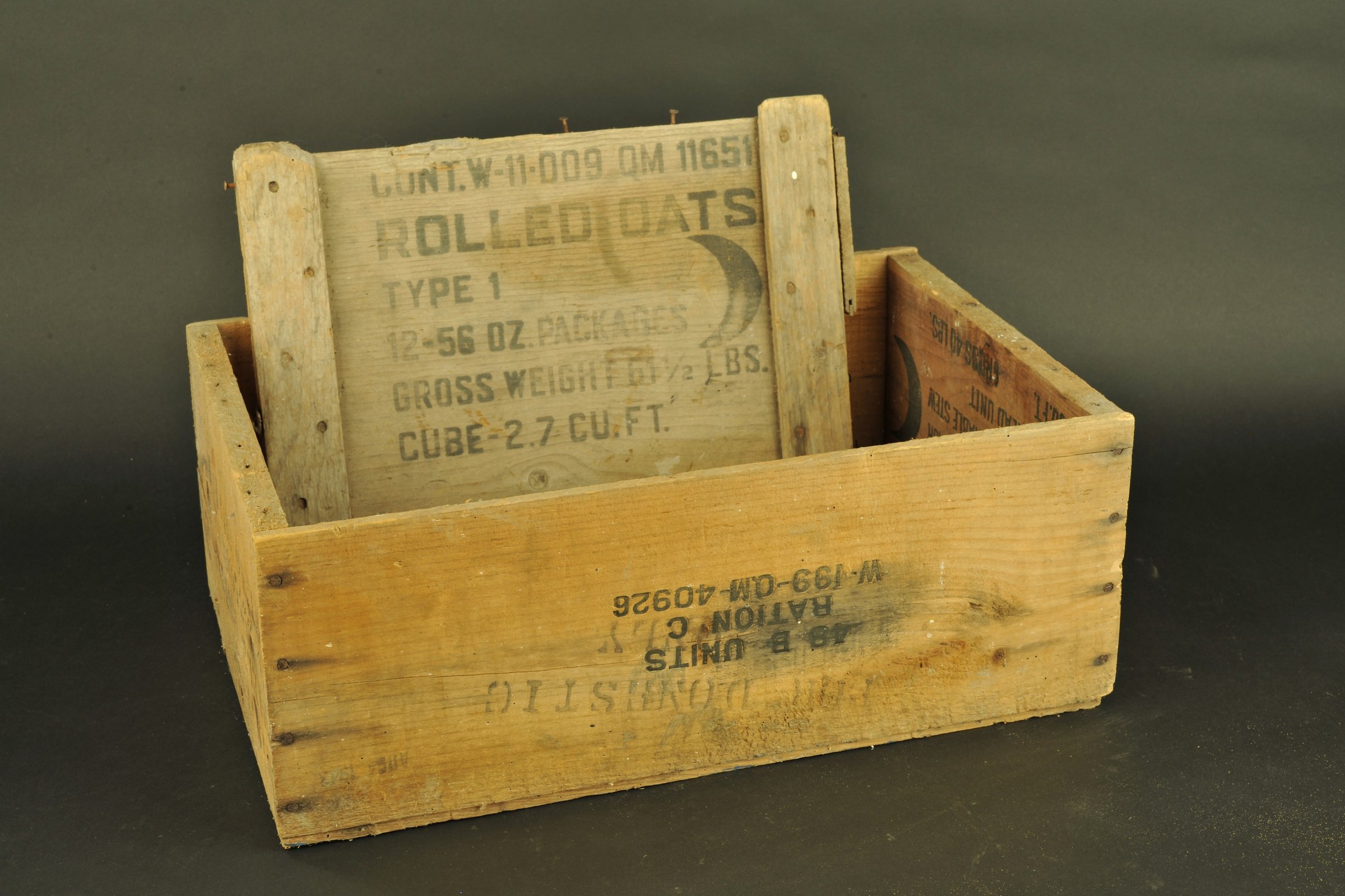 Caisse en bois ouverte, marquée sur le côté Rations C. On y joint un côté de caisse de ration US. Selon les informations du vendeur, cette pièce proviendrait du champs de bataille entre... en savoir plus
