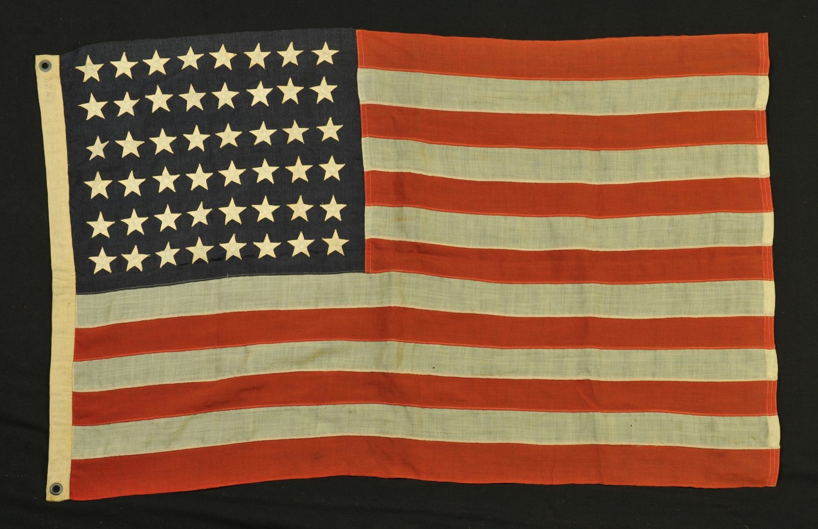 En tissu coton rouge et blanc, 48 étoiles en tissu coton blanc rapportées, œillets en métal. Marquages illisibles. Dimension 76 X 120 cm. A noter quelques marques d’usures et quelques... en savoir plus