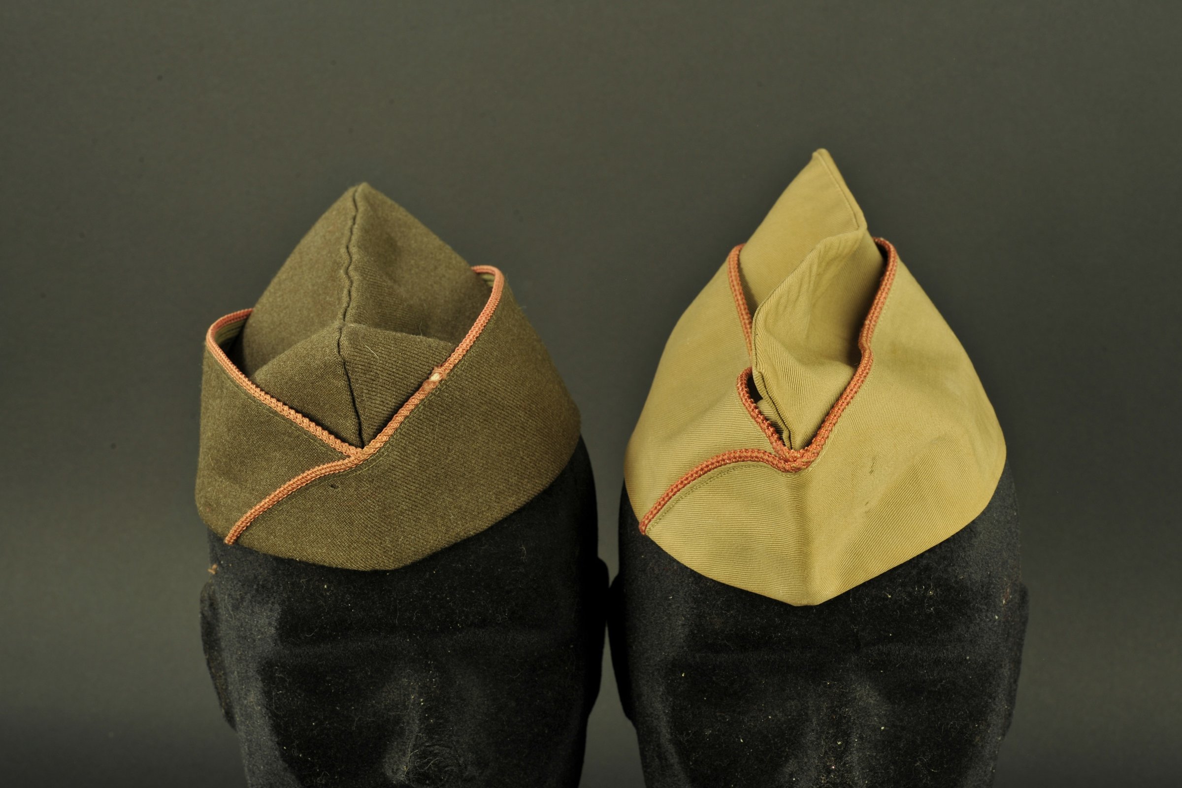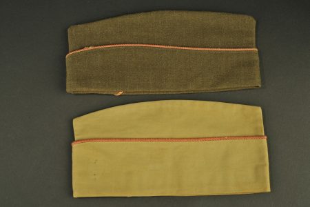 Comprenant un calot en tissu chino liseré chamois typique du Quatermaster Corps. Un calot en drap kaki, liseré chamois du Quatermaster Corps. Intérieurs doublés en satinette. Bandeaux de... en savoir plus