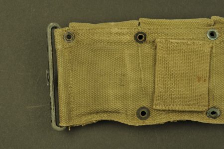 En forte toile OD, dix compartiments, tous les boutons pressions sont fonctionnels. Bouclerie en métal peint. Reste de marquage US. Marquage fabricant illisible, daté 1942. A noter une certaine... en savoir plus