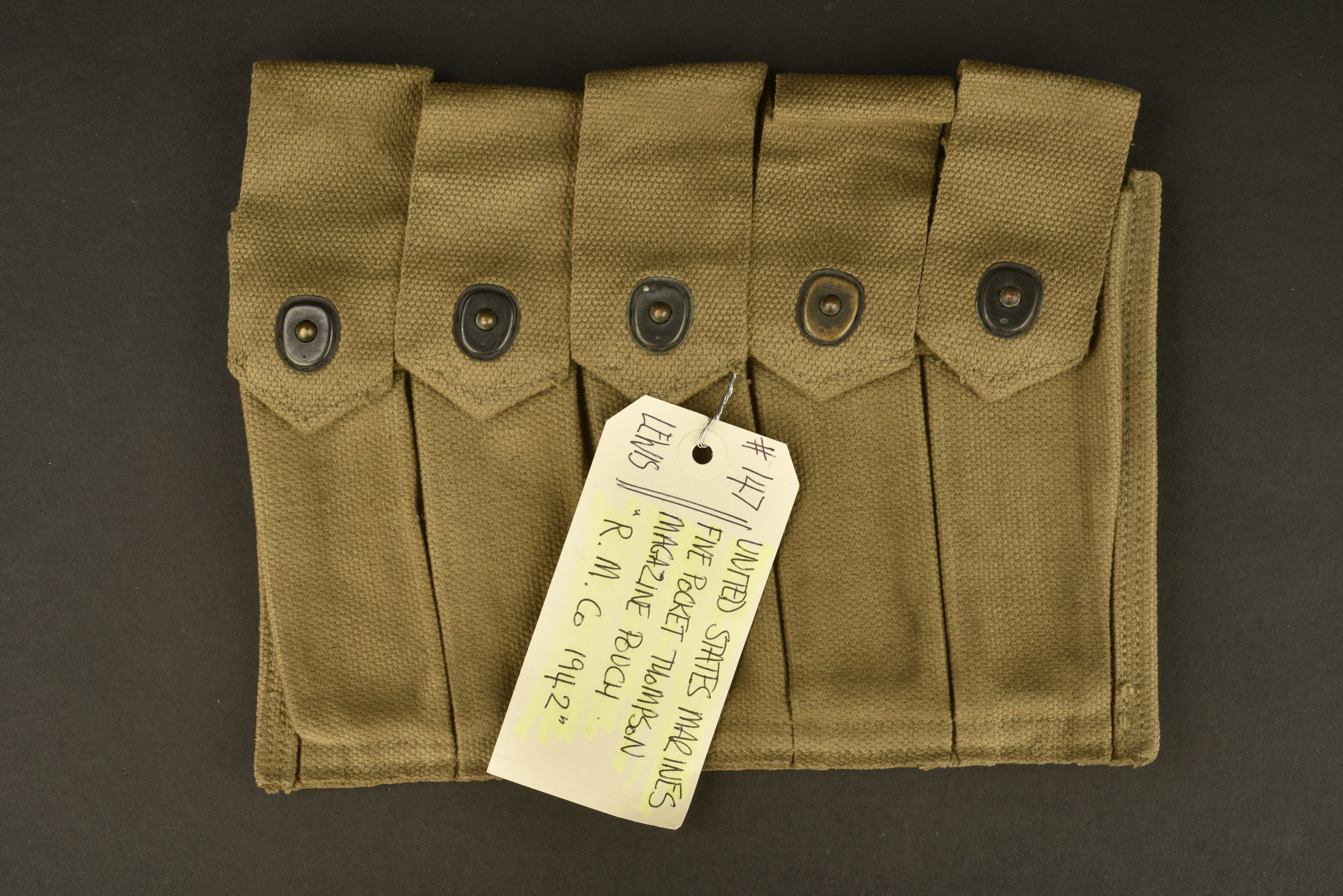 En forte toile OD, cinq compartiments pour chargeurs de Thompson. Tous les boutons pressions sont fonctionnels. Grand passant arrière marqué USMC, fabrication RMCO 1942. A noter une certaine... en savoir plus