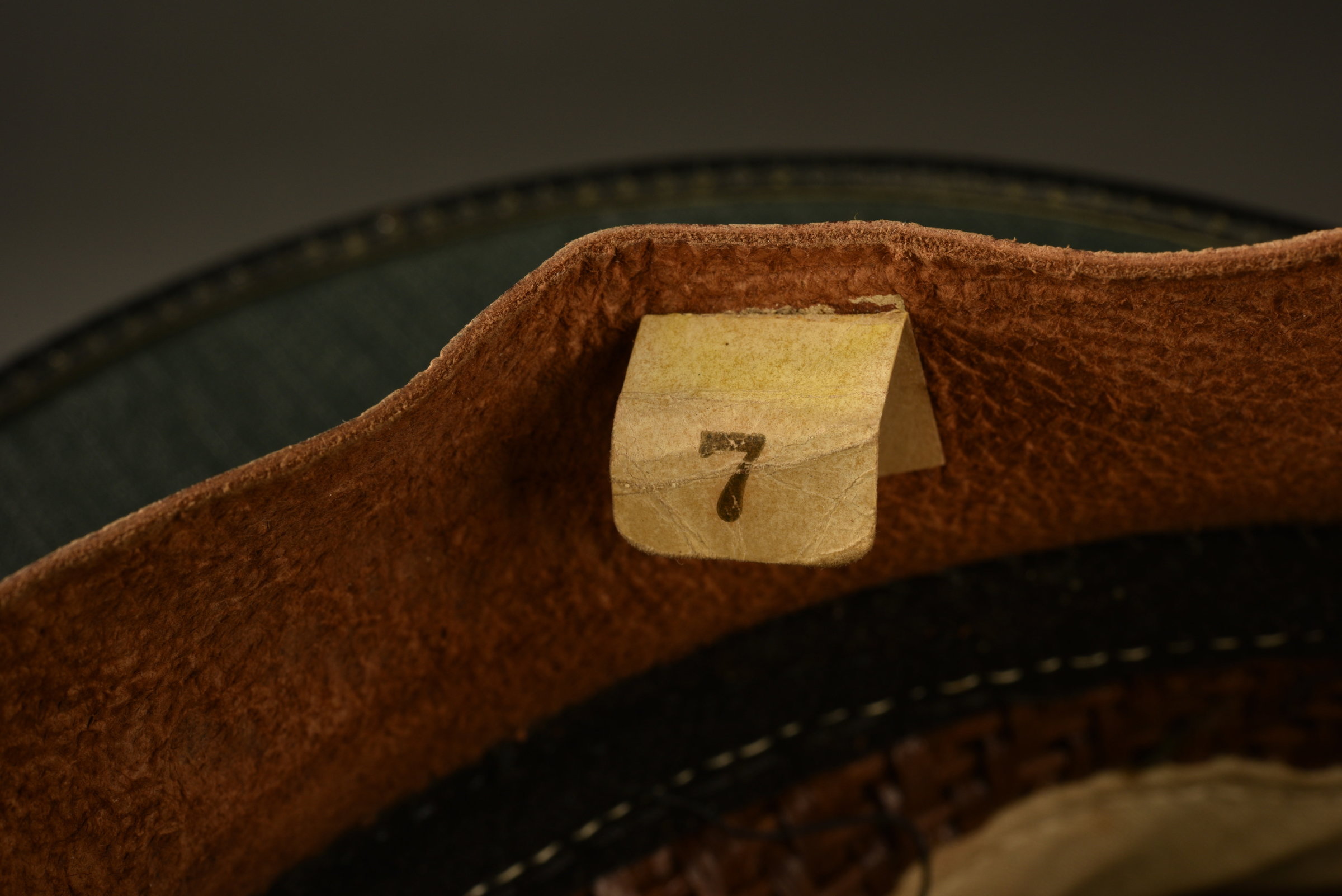 Coiffe en toile kaki, fausse jugulaire en fil or. Visière vernie. Insigne métallique et cannetille. Bandeau de transpiration en cuir marron, partiellement décousu. Etiquette du fabricant The... en savoir plus