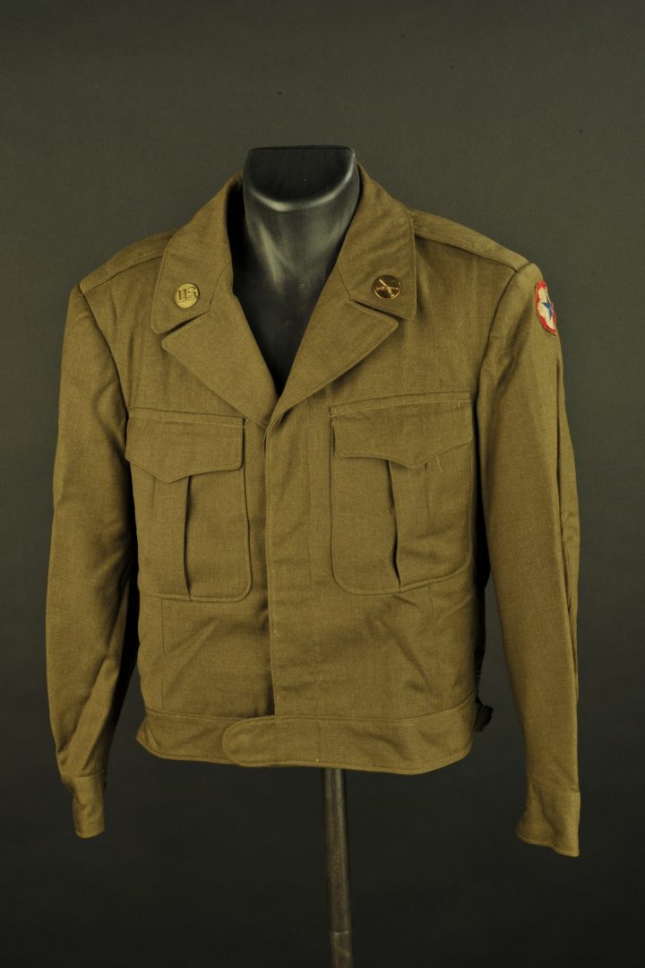 En drap kaki, tous les boutons sont présents. Patch de l’army service forces monté main. Disques de col troupe de l’infanterie. Etiquette dans le col indiquant une taille 40S. Etiquette du fabricant TDM clothing, date illisible. Nombreux tampons de réutilisation française. A noter une certaine usure et patine de la pièce. Photos supplémentaires sur www.aiolfi.com. Additional photos on www.aiolfi.com.