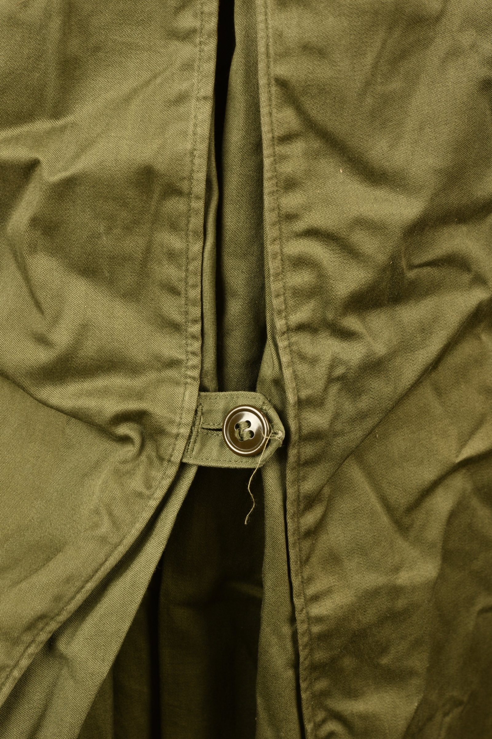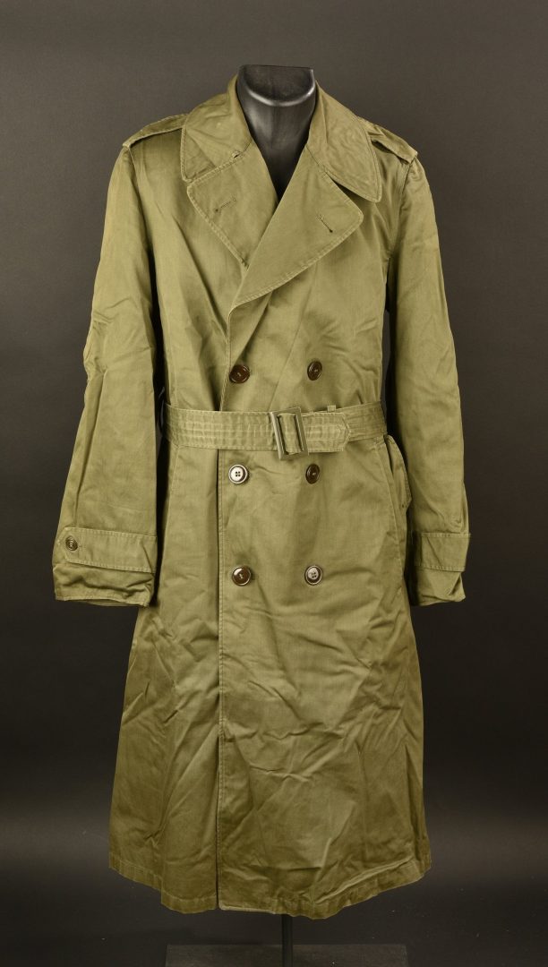 En toile OD, tous les boutons sont présents, ainsi que la ceinture. Etiquette du fabricant Cumberland Cloak Co Inc, en date du 26 juin 1953, taille Long Small. Doublure en drap et satinette... en savoir plus