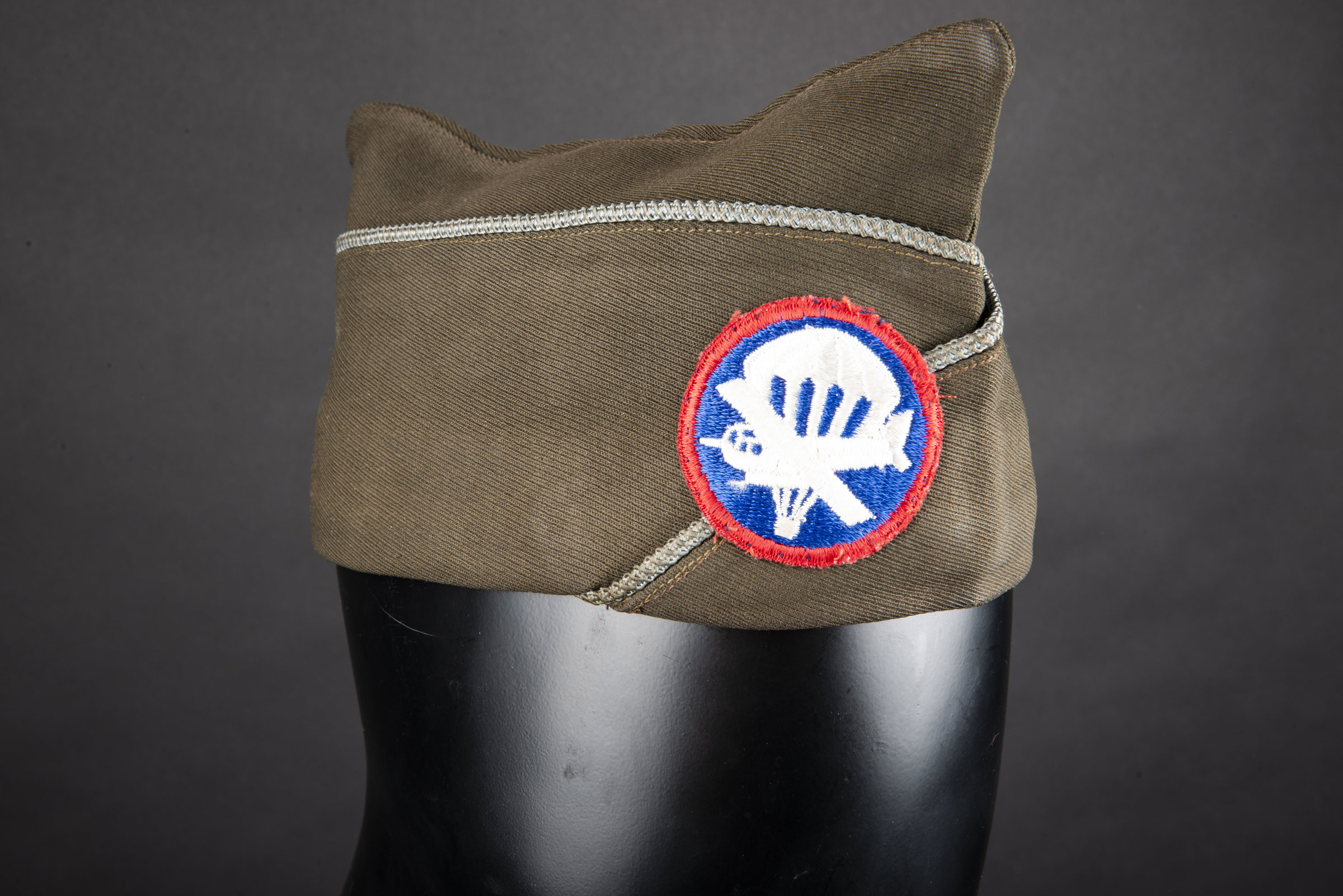 En tissu chocolat. Insigne des para glider monté main. Bandeau de transpiration en cuir fortement abîmé. Laundry number C-4765. A noter une certaine usure de la pièce. Photos supplémentaires... en savoir plus