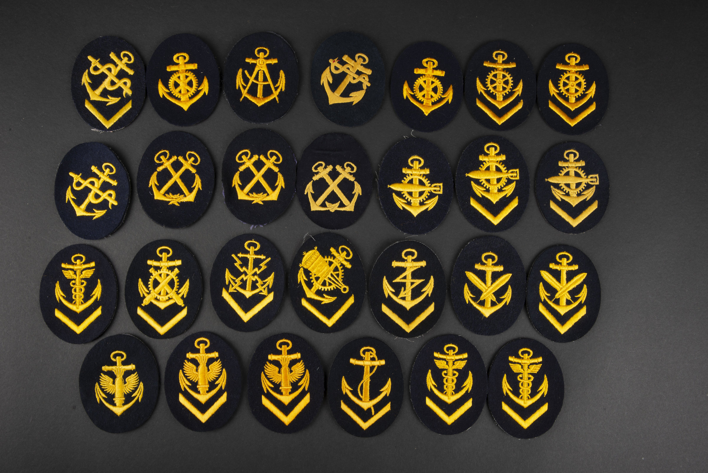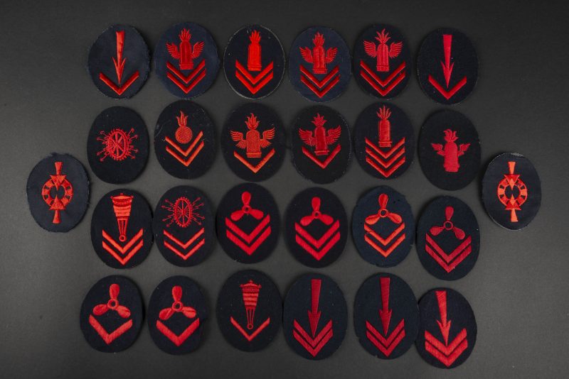 68 insignes sur fond en drap bleu marine, divers modèles et fabrications, divers époques. A noter une certaine usure et patine des pièces. On y joint six insignes métalliques sans attaches. ... en savoir plus