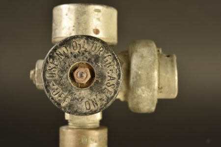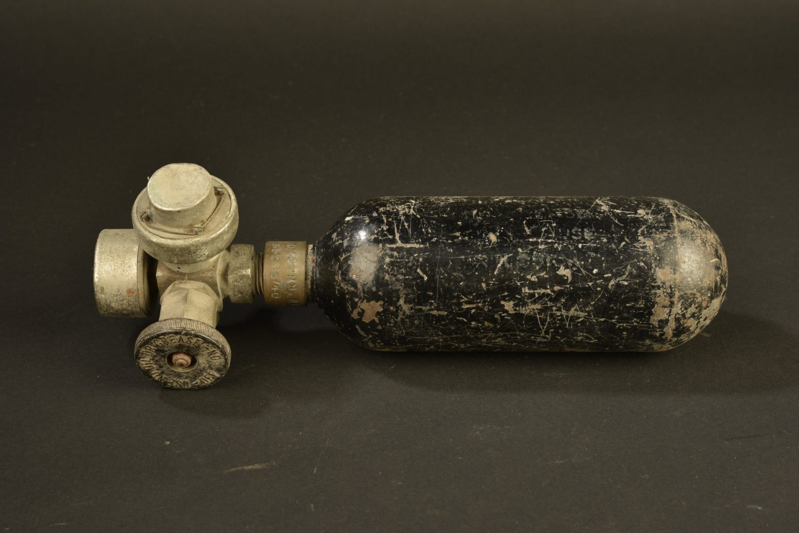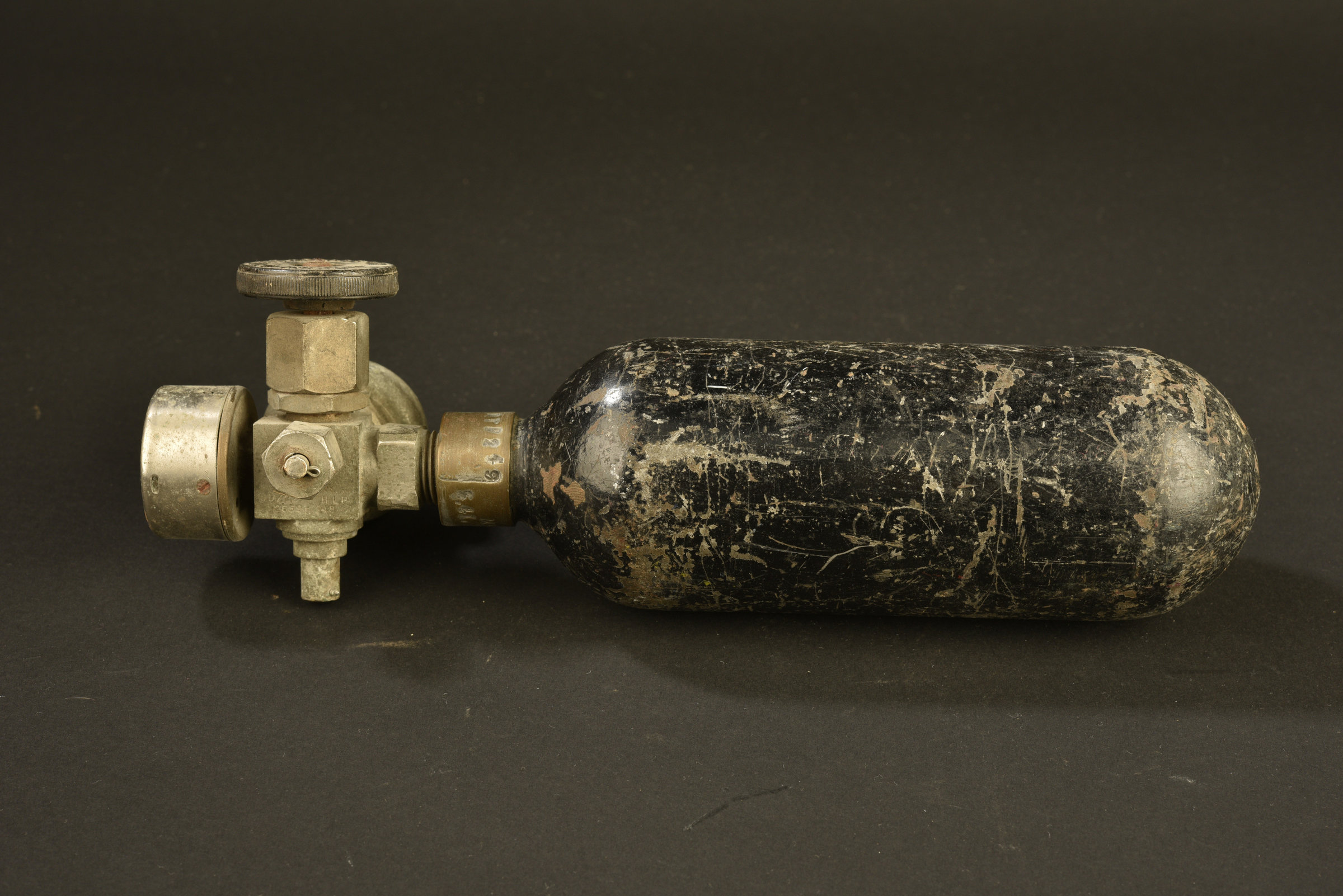 Petit modèle de bouteille à oxygène, peinture noire de la bombonne à 60%. Manomètre présent et complet. Marquage MK B 541 AM sous couronne 6D/432MN RT 1249 et 652 95/40. A noter une forte... en savoir plus