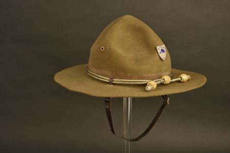 Chapeau en feutre kaki. Bandeau en mohair marron. Deux glands en fil dorés. Insigne métallique marqué 1 Co GHG CONN. Jugulaire en cuir complète. Etiquette indiquant une taille 7 3/8. Numéro... en savoir plus