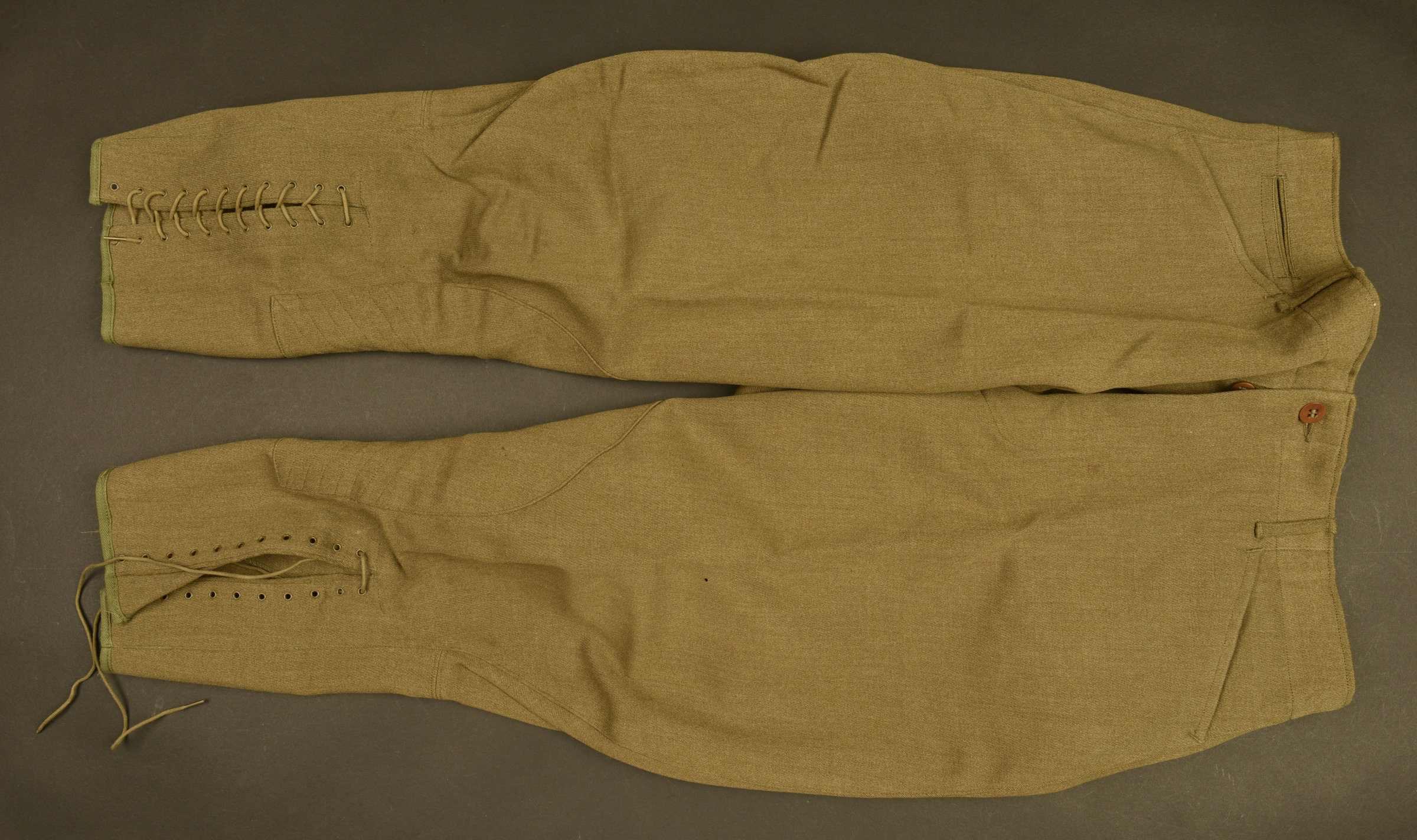 En tissu moutarde, tous les boutons sont présents. Renforts en épais tissu kaki au niveau de l’intérieur des genoux. Bas des jambes fermant par une double rangée de 11 œillets. Les... en savoir plus