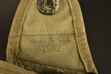 Housse en toile OD, les boutons pression sont fonctionnels, reste de marquage US sur la face avant, datée 1942. Le crochet de fixation au ceinturon est présent, rallonge cavalerie ou... en savoir plus