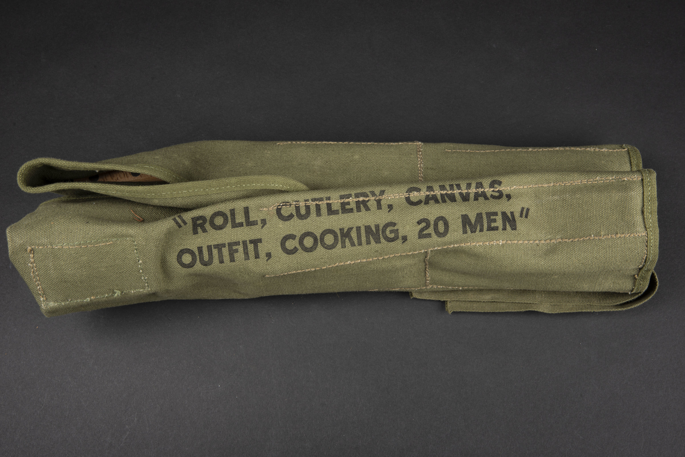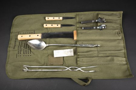 Housse en toile OD, marquages US Roll Cutlery Canvas Outfit Cooking 20 men. Les instructions sont présentes sous le rabat, daté 1943 ou 1945, le dernier chiffre est difficilement lisible. Tous... en savoir plus