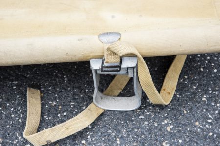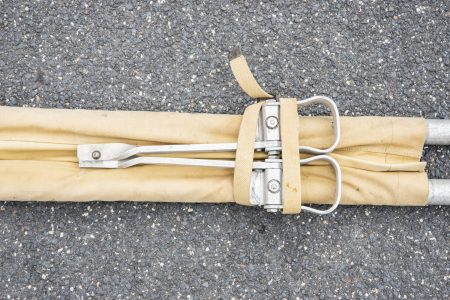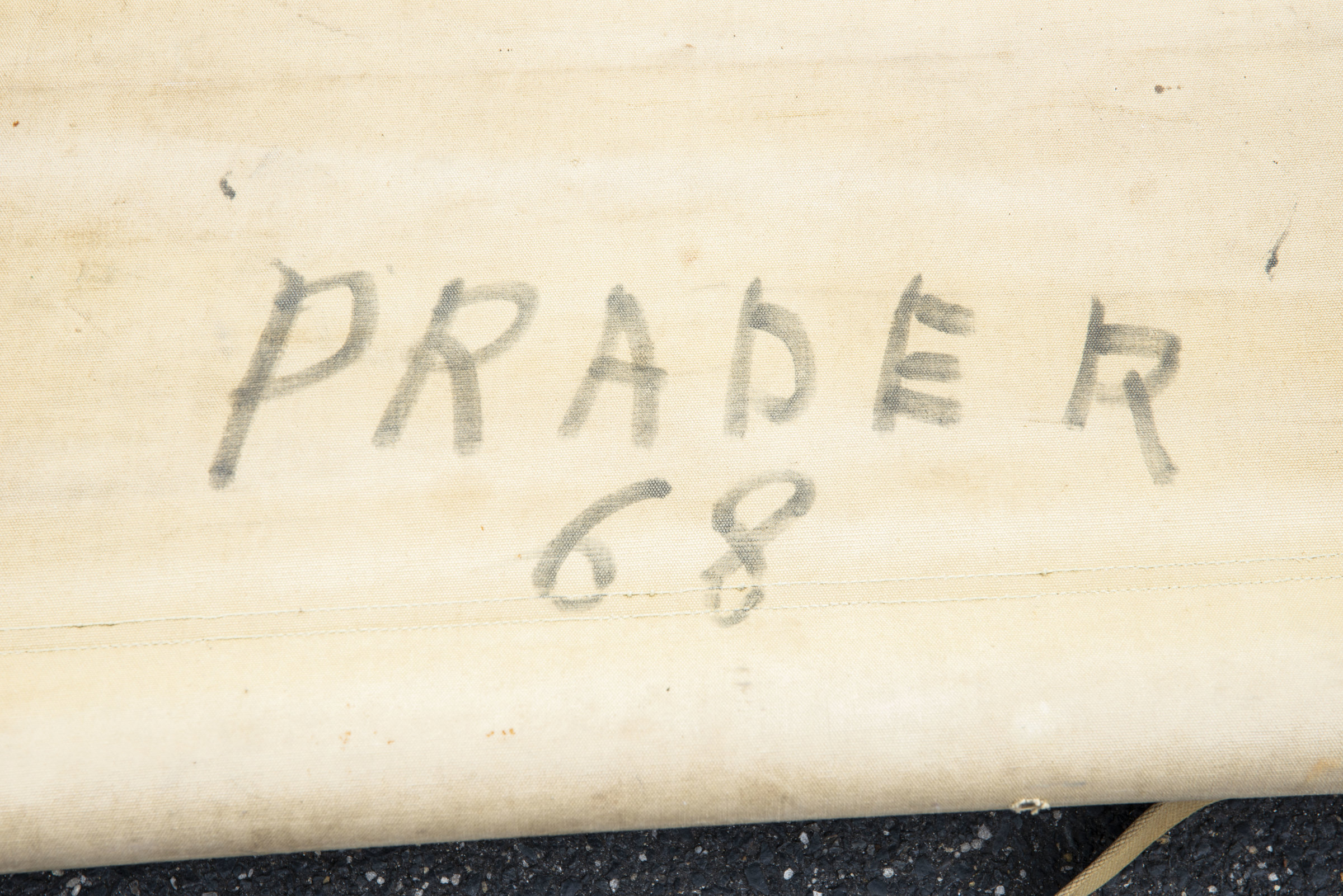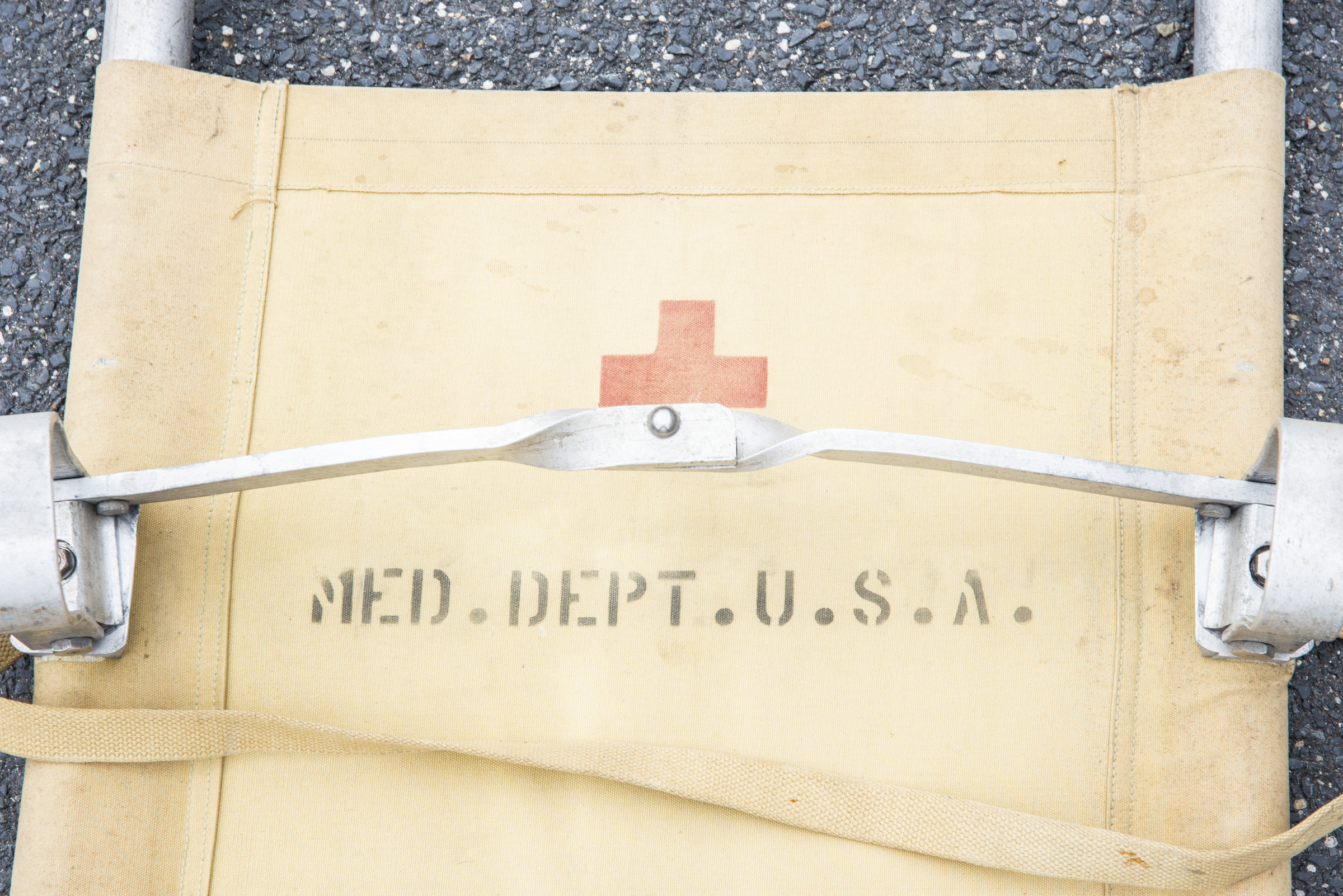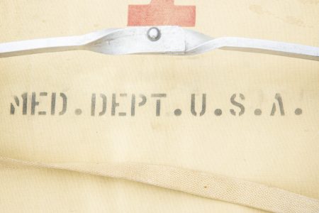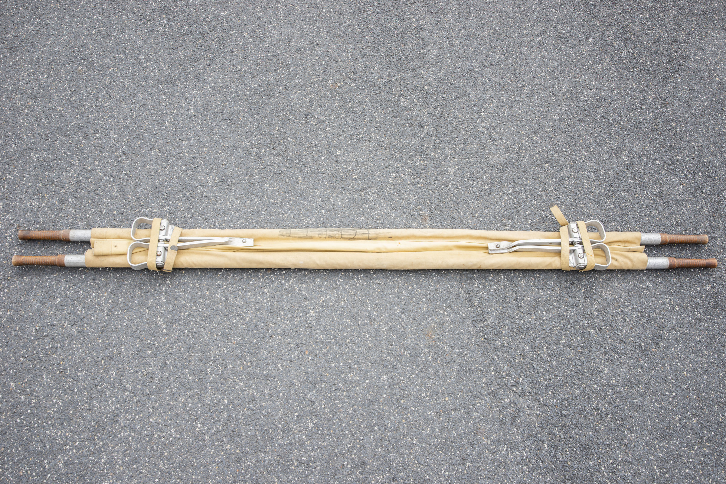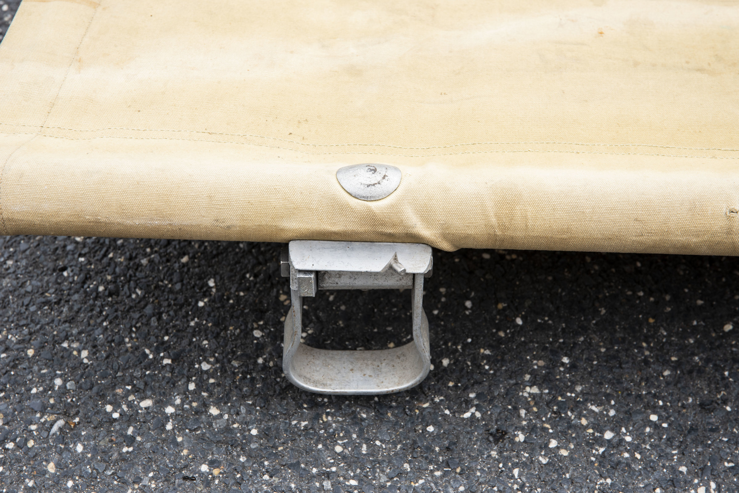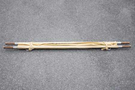 Armature en aluminium, quatre poignées en bois. Toile en tissu coton OD, quelques trous et tâches. Indication nominative Praper 68 à la peinture noire. Les sangles sont présentes. Marquages... en savoir plus