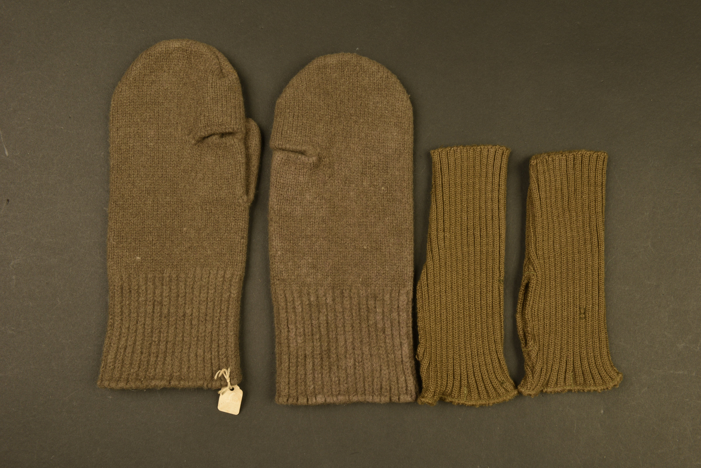 Comprenant une paire de mitaine en tissu kaki, sans marquages visibles. Une paire de moufle en drap kaki, paire homogène, étiquette marquée 100% Wool Medium Mens Swears. A noter une certaine... en savoir plus