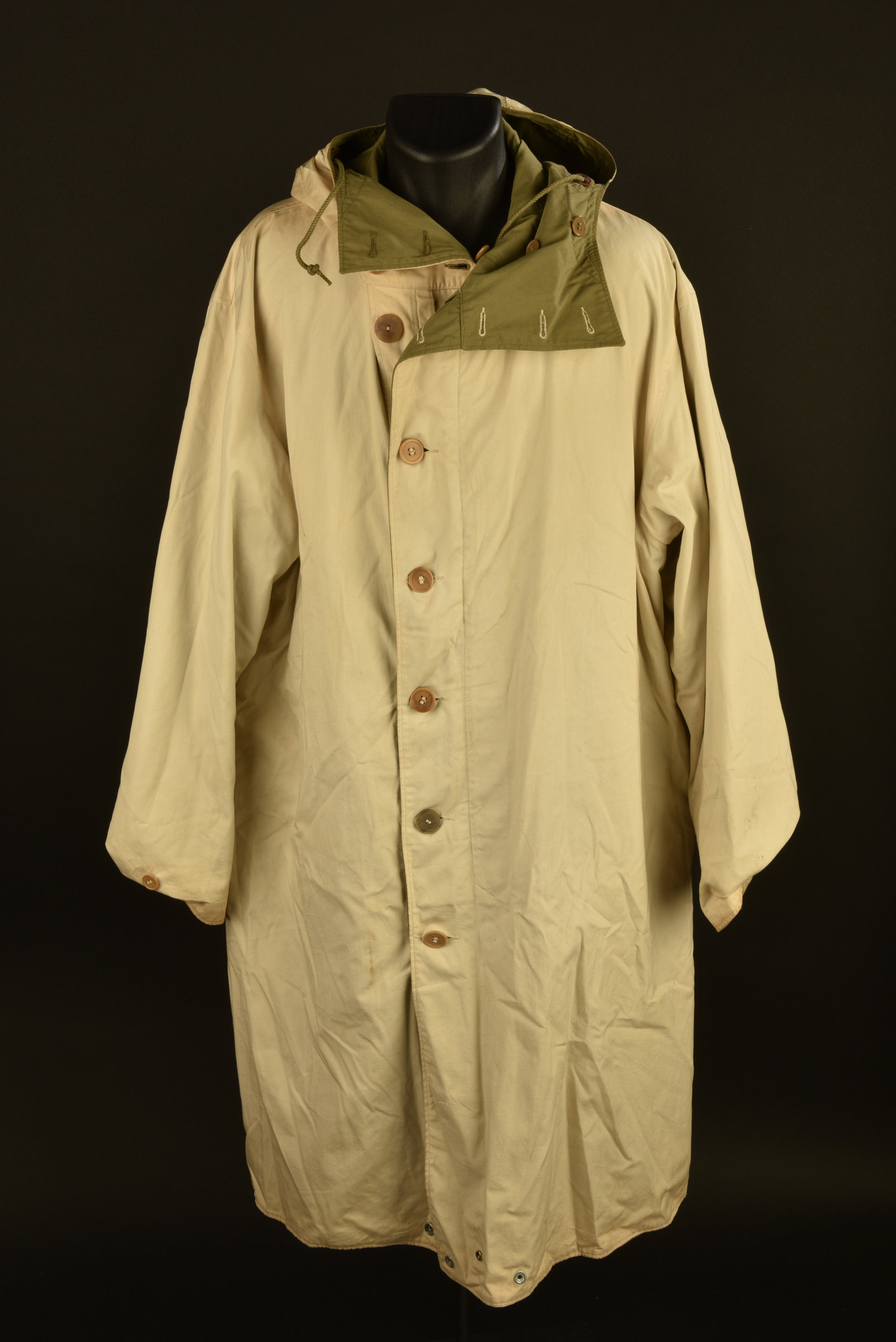 En popeline kaki, réversible blanc. Tous les boutons sont présents. Deux grandes poches de hanches et deux poches de poitrine. Le cordon de serrage de la capuche est complet. Capuche complète,... en savoir plus