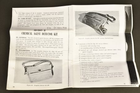 Housse en forte toile OD, bouton pression fonctionnel, sangle de transport présente. Marquages Chemical Agent Detector Kit M9. Tous les accessoires sont présents y compris la rarissime pompe.... en savoir plus