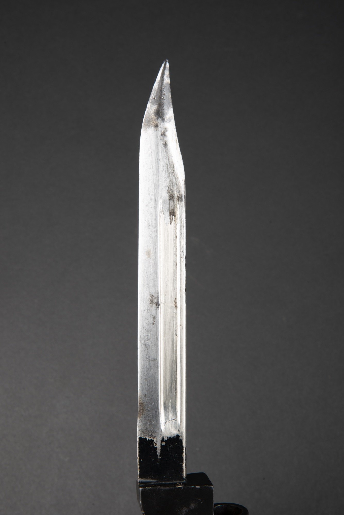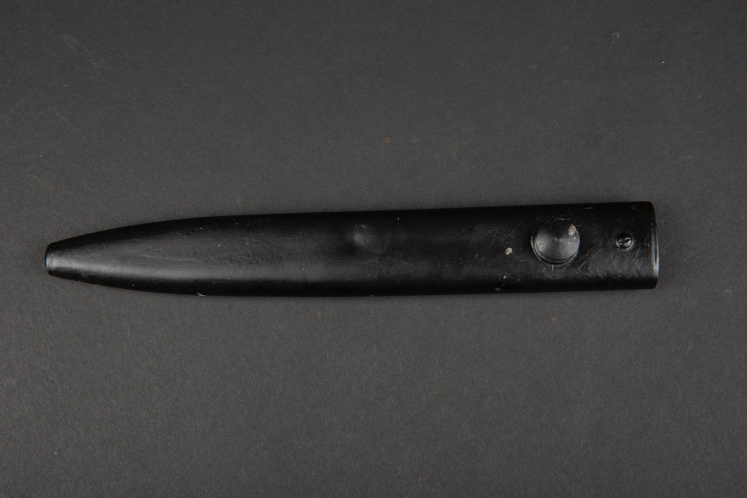 Complète avec son fourreau. Celui-ci est légèrement bosselé. Marquages N09 MK1 D-52. Lame graissé et en couleur d’origine à 80%. A noter une certaine patine de la pièce. Photos supplémentaires sur www.aiolfi.com. Additional photos on www.aiolfi.com.