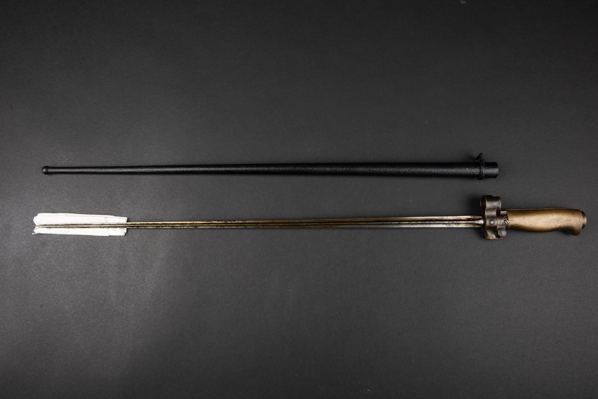 Manche en laiton, sans marquages visibles, lame complète dans sa longueur, fortement graissée, fourreau en métal, oxydé et repeint. A noter une certaine usure et patine de la pièce. Photos... en savoir plus