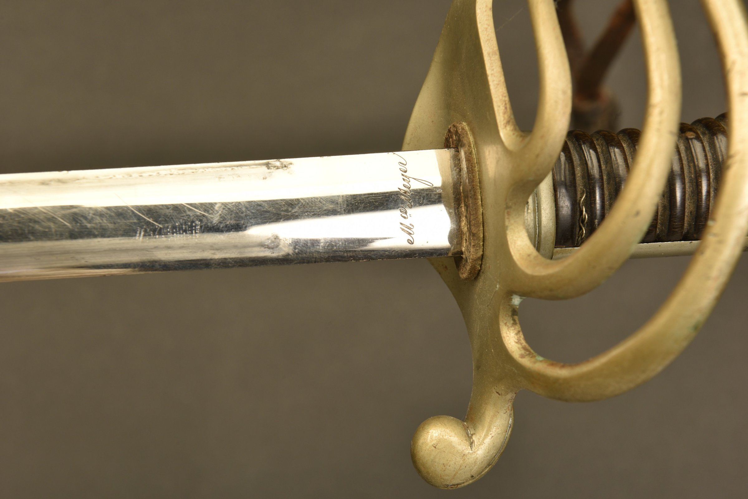 Poignée complète avec sa dragonne. Monogramme H sous couronne de marquis. Dragonne incomplète. Lame complète dans sa longueur, marquée MCE Meyer. Fourreau en métal complet. A noter quelques... en savoir plus