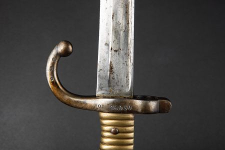 La poignée en laiton moulé est munie de quinze rainures, elle intègre un mécanisme de verrouillage avec bouton-poussoir avec lame ressort de rappel en acier fixée par un rivet, numéro Q... en savoir plus