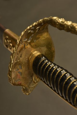 Garde en laiton ciselé et doré. Lame marquée Coulaux et Cie Mre de Klingenthal. IIIème république. Photos supplémentaires sur www.aiolfi.com. Additional photos on www.aiolfi.com.