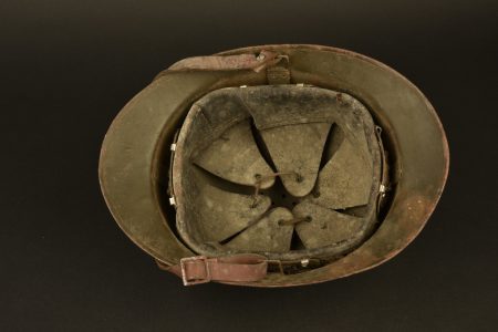 Coque de casque en métal, peinture kaki à 70%. Cimier en aluminium. Attribut du génie modèle 1937, présentant un certain jeu. Coiffe en cuir complète. Jugulaire en cuir complète. A noter... en savoir plus